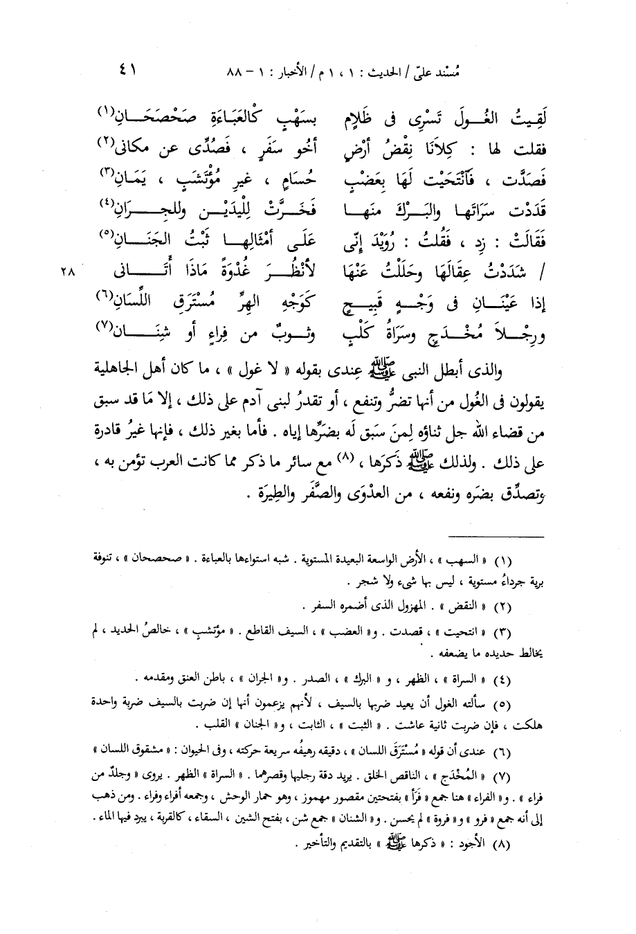 لَقِيتُ الْغُولَ تَسْرِي فِي ظَلَامٍ ... بِسَهْبٍ كَالْعَبَاءَةِ صَحْصَحَانِ