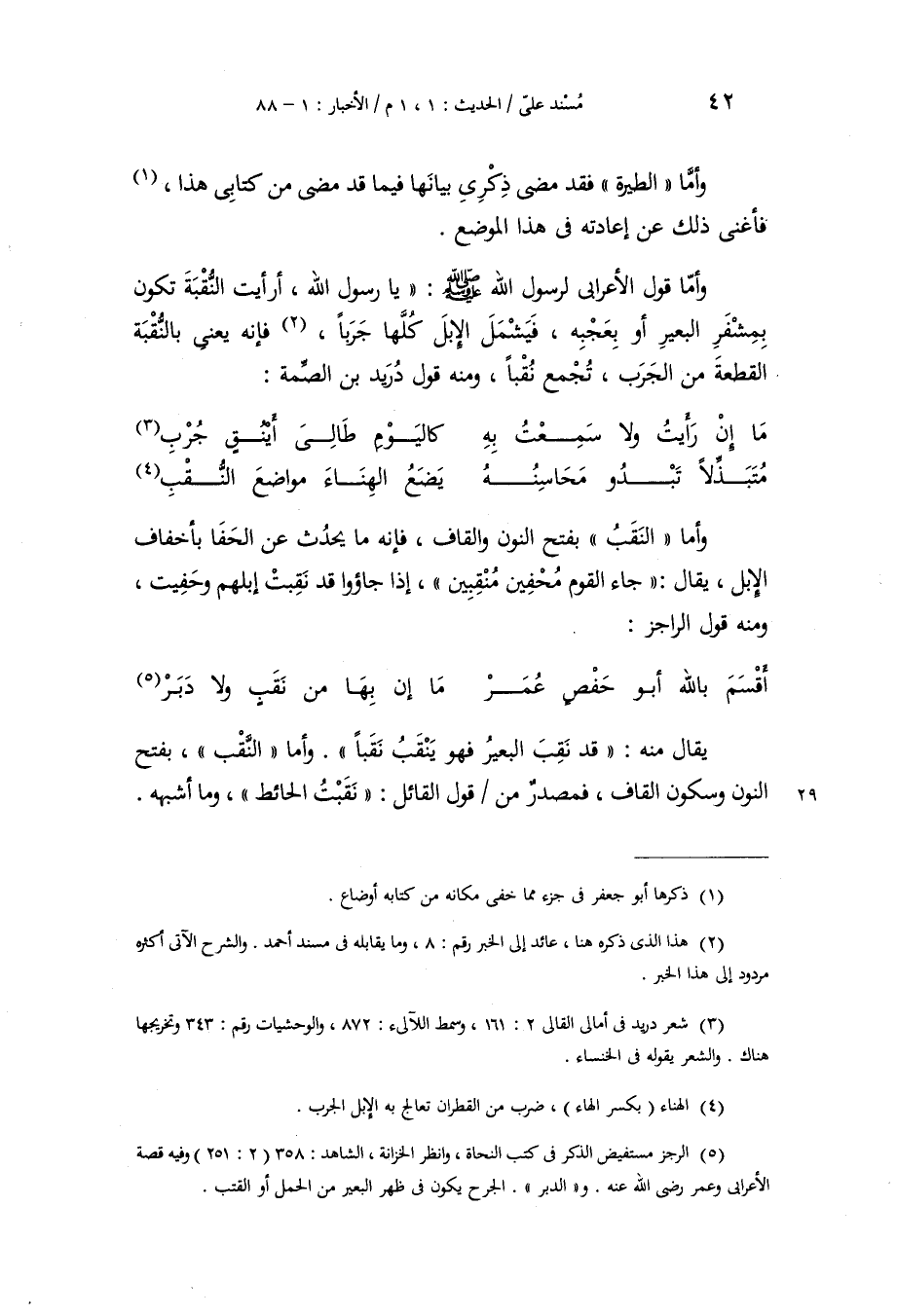 ، وَأَمَّا «الطِّيَرَةُ» فَقَدْ مَضَى ذِكْرِي بَيَانَهَا فِيمَا قَدْ مَضَى مِنْ كِتَابِي هَذَا، فَأَغْنَى ذَلِكَ عَنْ إِعَادَتِهِ فِي هَذَا الْمَوْضِعِ وَأَمَّا قَوْلُ الْأَعْرَابِيِّ لِرَسُولِ اللَّهِ صَلَّى اللهُ عَلَيْهِ وَسَلَّمَ: يَا رَسُولَ اللَّهِ " أَرَأَيْتَ النُّقْبَةَ تَكُونُ بِمِشْفَرِ الْبَعِيرِ أَوْ بِعَجْبِهِ، فَيَشْمَلُ الْإِبِلَ كُلَّهَا جَرَبًا، فَإِنَّهُ يَعْنِي بِالنُّقْبَةِ الْقِطْعَةَ مِنَ الْجَرَبِ، تُجْمَعُ نُقْبًا، وَمِنْهُ قَوْلُ دُرَيْدِ بْنِ الصِّمَّةِ: مَا إِنْ رَأَيْتُ وَلَا سَمِعْتُ بِهِ كَالْيَوْمِ طَالِي أَيْنُقٍ جُرْبِ مُتَبَذِّلًا تَبْدُوَ مَحَاسِنُهُ يَضَعُ الْهِنَاءَ مَوَاضِعَ النُّقْبِ، وَأَمَا النَّقَبُ بِفَتْحِ النُّونِ وَالْقَافِ، فَإِنَّهُ مَا يَحْدُثُ عَنِ الْحَفَا بِأَخْفَافِ الْإِبِلِ، يُقَالُ: جَاءَ الْقَوْمُ مُحْفِينَ مُنْقِبِينَ، إِذَا جَاءُوا قَدْ نَقِبَتْ إِبِلُهُمْ وَحَفِيَتْ، وَمِنْهُ قَوْلُ الرَّاجِزِ: