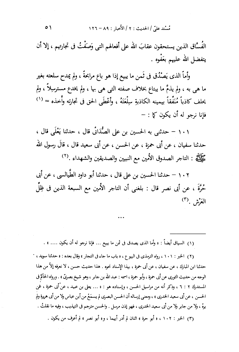 101 - حَدَّثَنِي بِهِ الْحُسَيْنُ بْنُ عَلِيٍّ الصُّدَائِيُّ، قَالَ: حَدَّثَنَا يَعْلَى، قَالَ: حَدَّثَنَا سُفْيَانُ، عَنْ أَبِي حَمْزَةَ، عَنِ الْحَسَنِ، عَنْ أَبِي سَعِيدٍ، قَالَ: قَالَ رَسُولُ اللَّهِ صَلَّى اللهُ عَلَيْهِ وَسَلَّمَ: «§التَّاجِرُ الصَّدُوقُ الْأَمِينُ مَعَ النَّبِيِّينَ، وَالصِّدِّيقِينَ، وَالشُّهَدَاءِ»