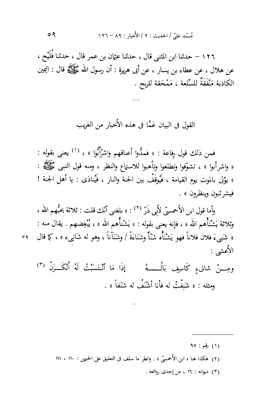 126 - حَدَّثَنَا ابْنُ الْمُثَنَّى، قَالَ: حَدَّثَنَا عُثْمَانُ بْنُ عُمَرَ، قَالَ: حَدَّثَنَا فُلَيْحٌ، عَنْ هِلَالٍ، عَنْ عَطَاءِ بْنِ يَسَارٍ، عَنْ أَبِي هُرَيْرَةَ، أَنَّ رَسُولَ اللَّهِ صَلَّى اللهُ عَلَيْهِ وَسَلَّمَ قَالَ: «§الْيَمِينُ الْكَاذِبَةُ مُنْفَقَةٌ لِلسِّلْعَةِ، مَمْحَقَةٌ لِلرِّبْحِ»