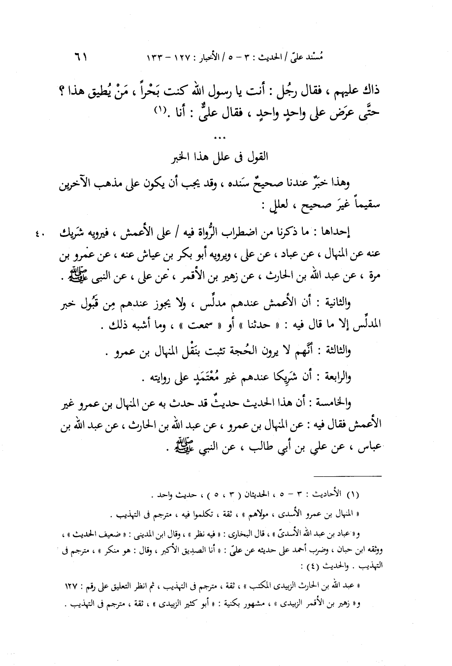§الْقَوْلُ فِي عِلَلِ هَذَا الْخَبَرِ وَهَذَا خَبَرٌ عِنْدَنَا صَحِيحٌ سَنَدُهُ، وَقَدْ يَجِبُ أَنْ يَكُونَ عَلَى مَذْهَبِ الْآخَرِينَ سَقِيمًا غَيْرَ صَحِيحٍ، لِعِلَلٍ: إِحْدَاهَا: مَا ذَكَرْنَا مِنَ اضْطِرَابِ الرُّوَاةِ فِيهِ عَلَى الْأَعْمَشِ، فَيَرْوِيهِ شَرِيكٌ عَنْهُ، عَنِ الْمِنْهَالِ، عَنْ عَبَّادٍ، عَنْ عَلِيٍّ، وَيَرْوِيهِ أَبُو بَكْرِ بنُ عَيَّاشٍ عَنْهُ، عَنْ عَمْرِو بْنِ مُرَّةَ، عَنْ عَبْدِ اللَّهِ بْنِ الْحَارِثِ، عَنْ زُهَيْرِ بْنِ الْأَقْمَرِ، عَنْ عَلِيٍّ، عَنِ النَّبِيِّ صَلَّى اللهُ عَلَيْهِ وَسَلَّمَ، وَالثَّانِيَةُ: أَنَّ الْأَعْمَشَ عِنْدَهُمْ مُدَلِّسٌ، وَلَا يَجُوزُ عِنْدَهُمْ مِنْ قَبُولِ خَبَرِ الْمُدَلِّسِ إِلَّا مَا قَالَ فِيهِ: حَدَّثَنَا أَوْ: سَمِعْتُ، وَمَا أَشْبَهَ ذَلِكَ، وَالثَّالِثَةُ: «أَنَّهُمْ لَا يَرَوْنَ الْحُجَّةَ تَثْبُتُ بِنَقْلِ الْمِنْهَالِ بْنِ عَمْرٍو» وَالرَّابِعَةُ: «أَنَّ شَرِيكًا عِنْدَهُمْ غَيْرُ مُعْتَمَدٍ عَلَى رِوَايَتِهِ» ، وَالْخَامِسَةُ: " أَنَّ هَذَا الْحَدِيثَ حَدِيثٌ قَدْ حَدَّثَ بِهِ عَنِ الْمِنْهَالِ بْنِ عَمْرٍو غَيْرُ الْأَعْمَشِ، فَقَالَ فِيهِ: عَنِ الْمِنْهَالِ بْنِ عَمْرٍو، عَنْ عَبْدِ اللَّهِ بْنِ الْحَارِثِ، عَنْ عَبْدِ اللَّهِ بْنِ عَبَّاسٍ، عَنْ عَلِيِّ بْنِ أَبِي طَالِبٍ، عَنِ النَّبِيِّ صَلَّى اللهُ عَلَيْهِ وَسَلَّمَ