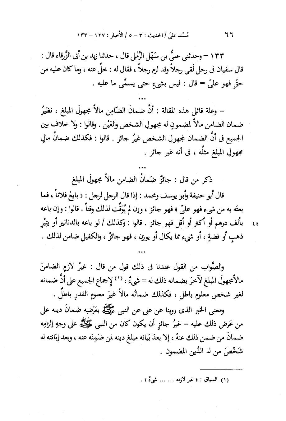 133 - وَحَدَّثَنِي عَلِيُّ بْنُ سَهْلٍ الرَّمْلِيُّ، قَالَ: حَدَّثَنَا زَيْدُ بْنُ أَبِي الزَّرْقَاءِ، قَالَ: قَالَ سُفْيَانُ فِي رَجُلٍ لَقِيَ رَجُلًا وَقَدْ لَزِمَ رَجُلًا، فَقَالَ لَهُ: «§خَلِّ عَنْهُ، وَمَا كَانَ عَلَيْهِ مِنْ حَقٍّ فَهُوَ عَلَيَّ» قَالَ: «لَيْسَ بشَيْءٍ حَتَّى يُسَمِّي مَا عَلَيْهِ» وَعِلَّةُ قَائِلِي هَذِهِ الْمَقَالَةِ: " أَنَّ ضَمَانَ الضَّامِنِ مَالًا مَجْهُولَ الْمَبْلَغِ نَظِيرَ ضَمَانِ الضَّامِنِ مَالًا لِمَضْمُونٍ لَهُ، مَجْهُولِ الشَّخْصِ وَالْعَيْنِ، وَقَالُوا: «وَلَا خِلَافَ بَيْنَ الْجَمِيعِ فِي أَنَّ الضَّمَانَ لِمَجْهُولِ الشَّخْصِ غَيْرُ جَائِزٍ» قَالُوا: فَكَذَلِكَ ضَمَانُ مَالٍ مَجْهُولِ الْمَبْلَغِ مِثْلُهُ، فِي أَنَّهُ غَيْرُ جَائِزٍ