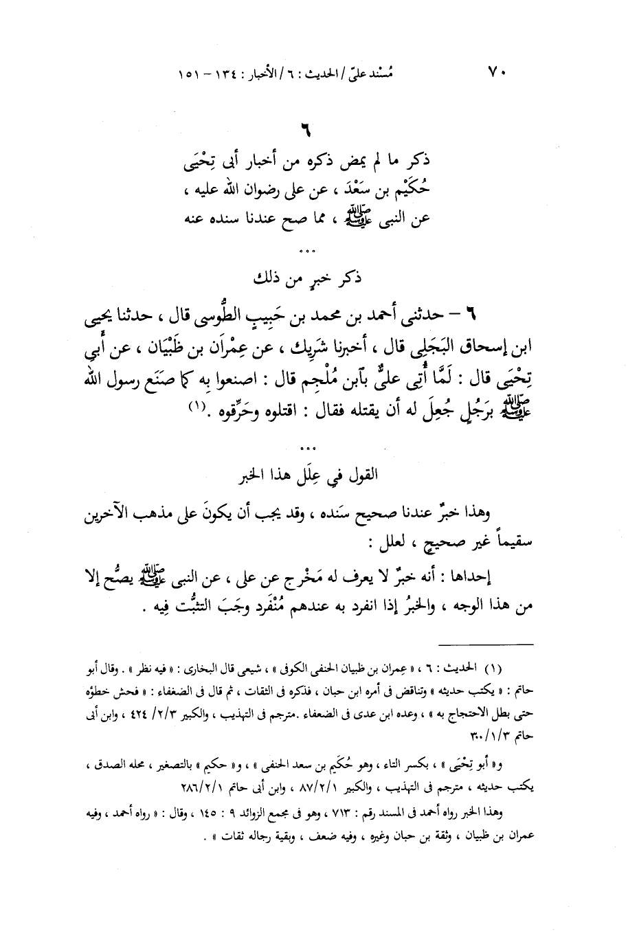 §الْقَوْلُ فِي عِلَلِ هَذَا الْخَبَرِ وَهَذَا خَبَرٌ عِنْدَنَا صَحِيحٌ سَنَدُهُ، وَقَدْ يَجِبُ أَنْ يَكُونَ عَلَى مَذْهَبِ الْآخَرِينَ سَقِيمًا غَيْرَ صَحِيحٍ، لِعِلَلٍ: إِحْدَاهَا: أَنَّهُ خَبَرٌ لَا يُعْرَفُ لَهُ مَخْرَجٌ عَنْ عَلِيٍّ، عَنِ النَّبِيِّ صَلَّى اللهُ عَلَيْهِ وَسَلَّمَ يَصِحُّ إِلَّا مِنْ هَذَا الْوَجْهِ، وَالْخَبَرُ إِذَا انْفَرَدَ بِهِ عِنْدَهُمْ مُنْفَرِدٌ وَجَبَ التَّثَبُّتُ فِيهِ