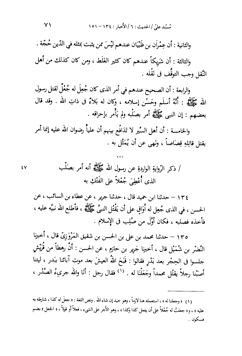 135 - حَدَّثَنَا مُحَمَّدُ بْنُ عَلِيِّ بْنِ الْحَسَنِ بْنِ شَقِيقٍ الْمَرْوَزِيُّ، قَالَ: أَخْبَرَنَا النَّضْرُ بْنُ شُمَيْلٍ، قَالَ: أَخْبَرَنَا جَرِيرُ بْنُ حَازِمٍ، عَنِ الْحَسَنِ، أَنَّ رَهْطًا مِنْ قُرَيْشٍ جَلَسُوا فِي الْحِجْرِ بَعْدَ بَدْرٍ فَقَالُوا: قَبَّحَ اللَّهُ الْعَيْشَ بَعْدَ مَوْتِ آبَائِنَا بِبَدْرٍ، لَيْتَنَا أَصَبْنَا رَجُلًا يَقْتُلُ مُحَمَّدًا، وَجَعَلْنَا لَهُ، فَقَالَ رَجُلٌ: أَنَا وَاللَّهِ جَرِيءُ الصَّدْرِ -[72]-، جَوَادُ الشَّدِّ، جَيِّدُ الْحَدِيدِ أَقْتُلُهُ، قَالَ: فَجَعَلَ لَهُ أَرْبَعَةُ رَهْطٍ، كُلُّ رَجُلٍ مِنْهُمْ أُوقِيَّةٌ مِنْ ذَهَبٍ، فَخَرَجَ حَتَّى قَدِمَ الْمَدِينَةَ، فَنَزَلَ عَلَى رَجُلٍ مِنْ قَوْمِهِ مُسْلِمٍ، فَقَالَ لَهُ: مَا جَاءَ بِكَ؟ قَالَ: أَسْلَمْتُ فَجِئْتُ. قَالَ: فَأَطْلَعَ اللَّهُ نَبِيَّهُ صَلَّى اللهُ عَلَيْهِ وَسَلَّمَ عَلَى مَا فِي نَفْسِهِ، فَبَعَثَ إِلَى الرَّجُلِ الَّذِي نَزَلَ عَلَيْهِ يَنْظُرُ ضَيْفَهُ , فَيَشُدُّهُ وَثَاقًا، ثُمَّ ابْعَثْ بِهِ إِلَيَّ. قَالَ: فَجَعَلَ الرَّجُلُ يُنَادِي حِينَ خَرَجُوا بِهِ: هَكَذَا تَفْعَلُونَ بِمَنْ تَبِعَكُمْ هَكَذَا تَفْعَلُونَ بِمَنِ اخْتَارَ دِينَكُمْ؟ فَقَالَ النَّبِيُّ صَلَّى اللهُ عَلَيْهِ وَسَلَّمَ: «اصْدُقْنِي» ، حَتَّى ظَنَّ النَّاسُ أَنَّهُ لَوْ صَدَقَهُ خَلَّى عَنْهُ، فَقَالَ: مَا جِئْتُ إِلَّا لِأُسْلِمَ , فَقَالَ: «كَذَبْتَ» ، ثُمَّ قَصَّ رَسُولُ اللَّهِ صَلَّى اللهُ عَلَيْهِ وَسَلَّمَ قِصَّتَهُ فِي قِصَّةِ الْقَوْمِ، فَقَالَ: " §مَا كَانَ ذَلِكَ، فَأَمَرَ بِهِ رَسُولُ اللَّهِ صَلَّى اللهُ عَلَيْهِ وَسَلَّمَ، فَصُلِبَ عَلَى ذُبَابٍ، فَإِنَّهُ لَأَوَّلُ مَصْلُوبٍ