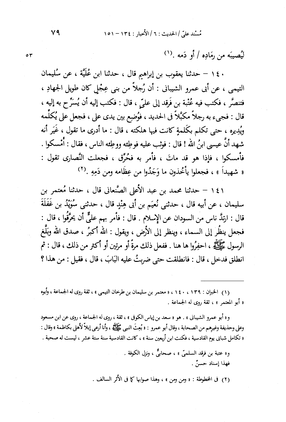 140 - حَدَّثَنَا يَعْقُوبُ بْنُ إِبْرَاهِيمَ، قَالَ: حَدَّثَنَا ابْنُ عُلَيَّةَ، عَنْ سُلَيْمَانَ التَّيْمِيِّ، عَنْ أَبِي عَمْرٍو الشَّيْبَانِيِّ، أَنَّ رَجُلًا، مِنْ بَنِي عِجْلٍ كَانَ طَوِيلَ الْجِهَادِ، فَتَنَصَّرَ، فَكَتَبَ فِيهِ عُتْبَةُ بْنُ فَرْقَدٍ إِلَى عَلِيٍّ قَالَ: «فَكَتَبَ إِلَيْهِ أَنْ يُسَرِّحَ بِهِ إِلَيْهِ» قَالَ: فَجِيءَ بِهِ رَجُلًا مُكَبَّلًا فِي الْحَدِيدِ، فَوُضِعَ بَيْنَ يَدَيْ عَلِيٍّ، فَجَعَلَ عَلِيٌّ يُكَلِّمُهُ وَيُدِيرُهُ، حَتَّى تَكَلَّمَ بِكَلِمَةٍ كَانَتْ فِيهَا هَلَكَتُهُ، قَالَ: " مَا أَدْرِي مَا تَقُولُ، غَيْرَ أَنَّهُ شَهِدَ أَنَّ عِيسَى ابْنُ اللَّهِ، قَالَ: «فَوَثَبَ عَلَيْهِ فَوَطِئَهُ، وَوَطِئَهُ النَّاسُ» فَقَالَ: أَمْسِكُوا، فَأَمْسَكُوا، فَإِذَا هُوَ قَدْ مَاتَ، فَأَمَرَ بِهِ فَحُرِّقَ، فَجَعَلَتِ النَّصَارَى تَقُولُ: «§شَهِيدًا، فَجَعَلُوا يَأْخُذُونَ مَا وَجَدُوا مِنْ عِظَامِهِ، وَمِنْ دَمِهِ»