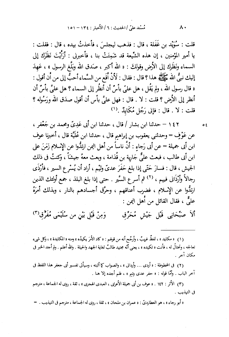 142 - حَدَّثَنَا ابْنُ بَشَّارٍ، قَالَ: حَدَّثَنَا ابْنُ أَبِي عَدِيٍّ، وَمُحَمَّدُ بْنُ جَعْفَرٍ، عَنْ عَوْفٍ، وَحَدَّثَنِي يَعْقُوبُ بْنُ إِبْرَاهِيمَ، قَالَ: حَدَّثَنَا ابْنُ عُلَيَّةَ، قَالَ: أَخْبَرَنَا عَوْفُ بْنُ أَبِي جَمِيلَةَ، عَنْ أَبِي رَجَاءٍ، أَنَّ نَاسًا مِنْ أَهْلِ الْيَمَنِ ارْتَدُّوا عَنِ الْإِسْلَامِ زَمَنَ عَلِيِّ بْنِ أَبِي طَالِبٍ، فَبَعَثَ عَلِيُّ جَارِيَةَ بْنَ قُدَامَةَ، وَبَعَثَ مَعَهُ جَيْشًا، وَكُنْتُ فِي ذَلِكَ الْجَيْشِ، قَالَ: فَسَارَ حَتَّى إِذَا بَلَغَ حَفْرَ عَدِيٍّ وَتَيْمٍ، أَرَادَ أَنْ يُسْرِعَ السَّيْرَ، فَأَرْذَى رِجَالًا، وَأرْذَانِي فِيهِمْ، ثُمَّ أَسْرَعَ السَّيْرَ، حَتَّى إِذَا بَلَغَ الْبَلَدَ جَمَعَ أُولَئِكَ الَّذِينَ ارْتَدُّوا عَنِ الْإِسْلَامِ، فَضَرَبَ أَعْنَاقَهُمْ، وَحَرَّقَ أَجْسَادَهُمْ بِالنَّارِ، وَبِذَلِكَ أَمَرَهُ عَلِيٌّ، فَقَالَ الْقَائِلُ مِنْ أَهْلِ الْيَمَنِ: