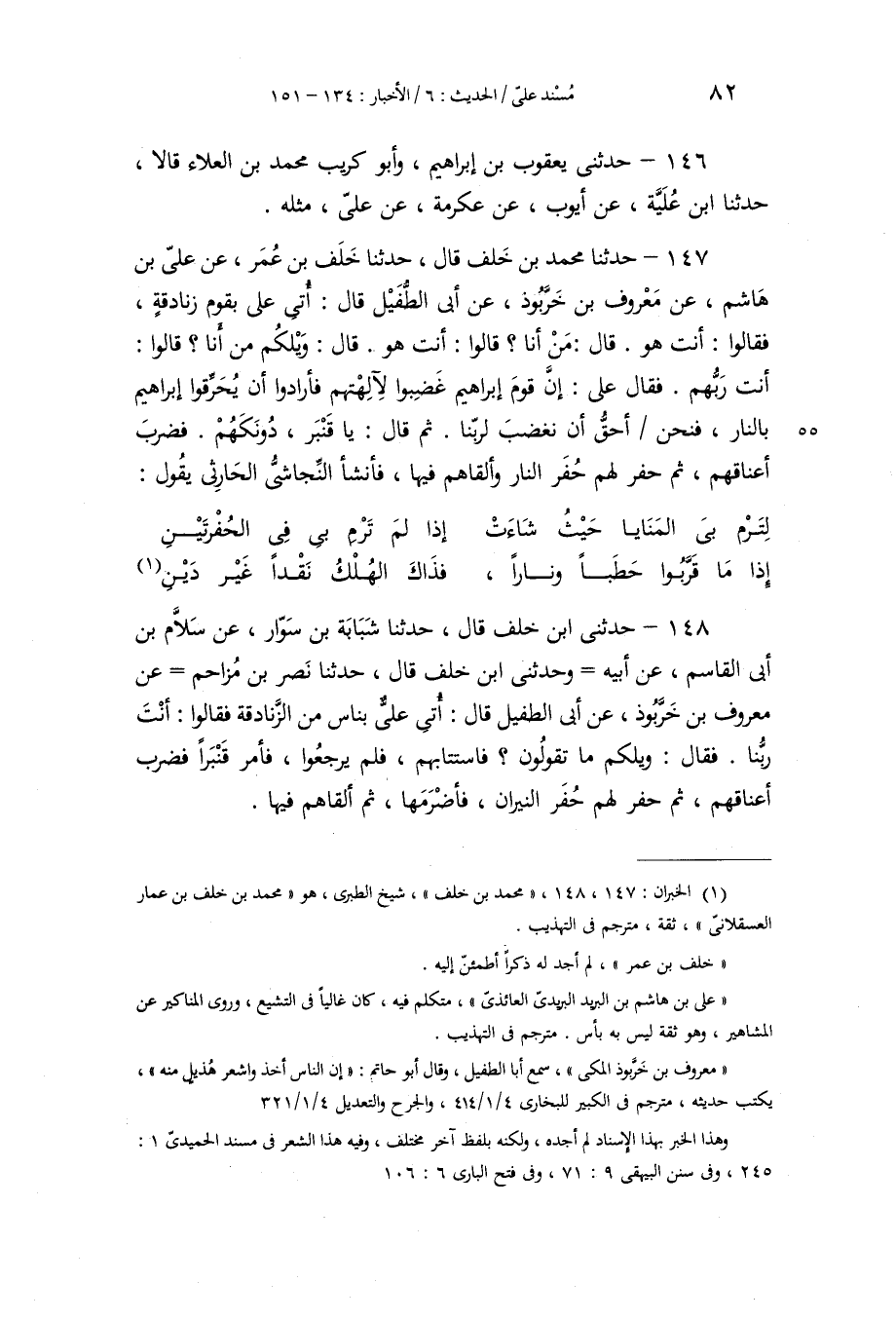 147 - حَدَّثَنَا مُحَمَّدُ بْنُ خَلَفٍ، قَالَ: حَدَّثَنَا خَلَفُ بْنُ عُمَرَ، عَنْ عَلِيِّ بْنِ هَاشِمٍ، عَنْ مَعْرُوفِ بْنِ خَرَّبُوذَ، عَنْ أَبِي الطُّفَيْلِ، قَالَ: أُتِيَ عَلِيٌّ بِقَوْمٍ زَنَادِقَةٍ، فَقَالُوا: أَنْتَ هُوَ، قَالَ: مَنْ أَنَا؟ قَالُوا: أَنْتَ هُوَ، قَالَ: وَيْلَكُمْ مَنْ أَنَا؟ قَالُوا: أَنْتَ رَبُّهُمْ، فَقَالَ عَلِيٌّ: إِنَّ قَوْمَ إِبْرَاهِيمَ غَضِبُوا لِآلِهَتِهِمْ فَأَرَادُوا أَنْ يُحَرِّقُوا إِبْرَاهِيمَ بِالنَّارِ، فَنَحْنُ أَحَقُّ أَنْ نَغْضَبَ لِرَبِّنَا، ثُمَّ قَالَ: يَا قَنْبَرُ، دُونَكَهُمْ، فَضَرَبَ أَعْنَاقَهُمْ، ثُمَّ حَفَرَ لَهُمْ حُفَرَ النَّارِ، وَأَلْقَاهُمْ فِيهَا، فَأَنْشَأَ النَّجَاشِيُّ الْحَارِثِيُّ يَقُولُ: