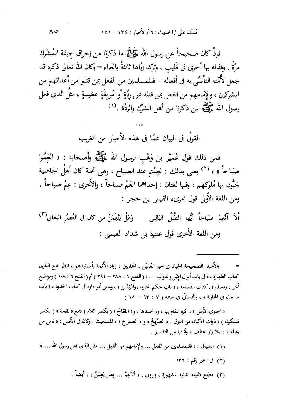 §الْقَوْلُ فِي الْبَيَانِ عَمَّا فِي هَذِهِ الْأَخْبَارِ مِنَ الْغَرِيبِ فَمِنْ ذَلِكَ قَوْلُ عُمَيْرِ بْنِ وَهْبٍ لِرَسُولِ اللَّهِ صَلَّى اللهُ عَلَيْهِ وَسَلَّمَ وَأَصْحَابِهِ: انْعَمُوا صَبَاحًا، يَعْنِي بِذَلِكَ: نَعِمْتُمْ عِنْدَ الصَّبَّاحِ، وَهِيَ تَحِيَّةٌ كَانَ أَهْلُ الْجَاهِلِيَّةِ يُحَيُّونَ بِهَا مُلُوكَهُمْ، وَفِيهَا لُغَتَانِ: إِحْدَاهُمَا انْعَمْ صَبَاحًا، وَالْآخَرُ: عِمْ صَبَاحًا، وَمِنَ اللُّغَةِ الْأُولَى قَوْلُ امْرِئِ الْقَيْسِ بْنِ حُجْرٍ: