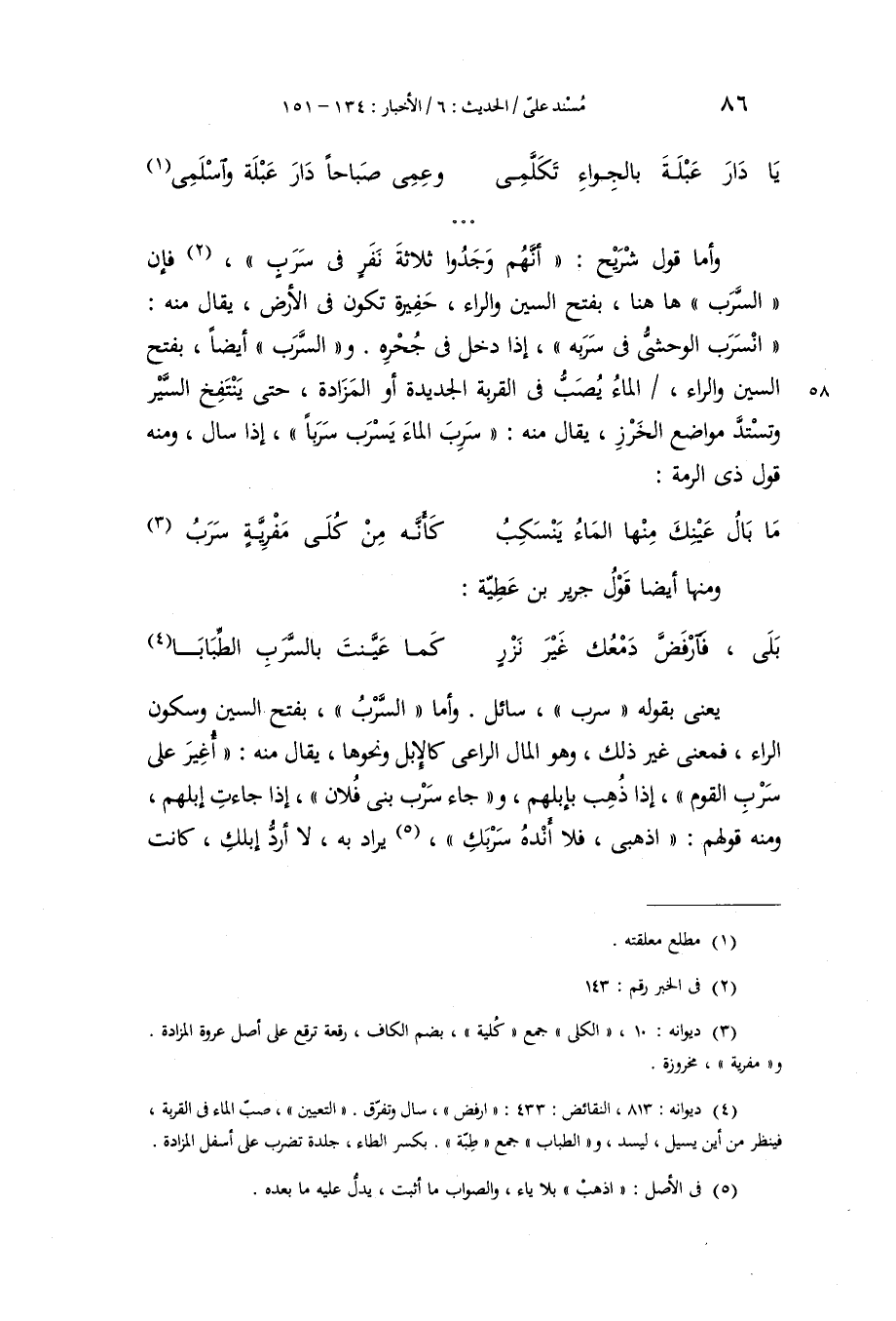 يَعْنِي بِقَوْلِهِ سَرَبَ سَائِلٌ وَأَمَّا السَّرْبُ بِفَتْحِ السِّينِ وَسُكُونِ الرَّاءِ، فَمَعْنًى غَيْرُ ذَلِكَ، وَهُوَ الْمَالُ الرَّاعِي، كَالْإِبِلِ وَنَحْوِهَا، يُقَالُ مِنْهُ: أُغِيرَ عَلَى سَرْبِ الْقَوْمِ، إِذَا ذُهِبَ بِإِبِلِهِمْ، وَجَاءَ سَرْبُ بَنِي فُلَانٍ، إِذَا جَاءَتْ إِبِلُهُمْ، وَمِنْهُ قَوْلُهُمْ: «اذْهَبِي، فَلَا أَنْدَهُ سَرْبَكِ» يُرَادُ بِهِ: لَا أَرُدُّ إِبِلَكِ، كَانَتِ
