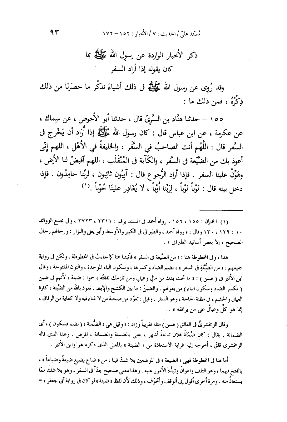 155 - حَدَّثَنَا هَنَّادُ بْنُ السَّرِيِّ، قَالَ: حَدَّثَنَا أَبُو الْأَحْوَصِ، عَنْ سِمَاكٍ، عَنْ عِكْرِمَةَ، عَنِ ابْنِ عَبَّاسٍ، قَالَ: كَانَ رَسُولُ اللَّهِ صَلَّى اللهُ عَلَيْهِ وَسَلَّمَ إِذَا أَرَادَ أَنْ يَخْرُجَ فِي السَّفَرِ قَالَ: «اللَّهُمَّ أَنْتَ الصَّاحِبُ فِي السَّفَرِ , وَالْخَلِيفَةُ فِي الْأَهْلِ، اللَّهُمَّ إِنِّي أَعُوذُ بِكَ مِنَ الضَّيْعَةِ فِي السَّفَرِ، وَالْكَآبَةِ فِي الْمُنْقَلَبِ، اللَّهُمَّ اقْبِضْ لَنَا الْأَرْضَ، وَهَوِّنْ عَلَيْنَا السَّفَرَ» ، فَإِذَا أَرَادَ الرُّجُوعَ قَالَ: «آيِبُونَ تَائِبُونَ، لِرَبِّنَا حَامِدُونَ» ، فَإِذَا دَخَلَ بَيْتَهُ، قَالَ: «§تَوْبًا تَوْبًا، لِرَبِّنَا أَوْبًا، لَا يُغَادِرُ عَلَيْنَا حُوبًا»
