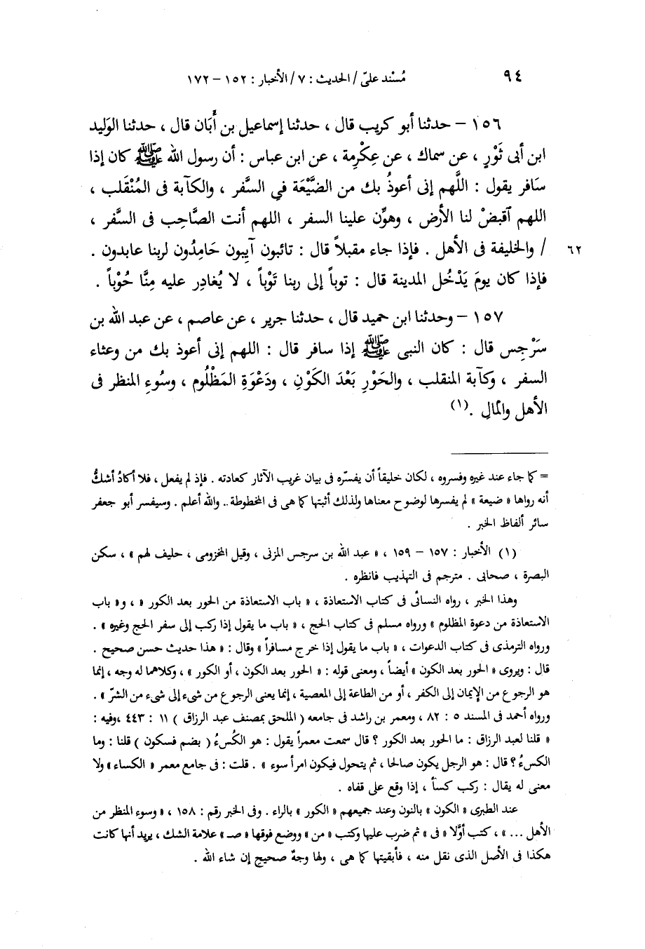 157 - وَحَدَّثَنَا ابْنُ حُمَيْدٍ، قَالَ: حَدَّثَنَا جَرِيرٌ، عَنْ عَاصِمٍ، عَنْ عَبْدِ اللَّهِ بْنِ سَرْجِسٍ، قَالَ: كَانَ النَّبِيُّ صَلَّى اللهُ عَلَيْهِ وَسَلَّمَ إِذَا سَافَرَ قَالَ: «§اللَّهُمَّ إِنِّي أَعُوذُ بِكَ مِنْ وَعْثَاءِ السَّفَرِ، وَكَآبَةِ الْمُنْقَلَبِ، وَالْحَوْرِ بَعْدَ الْكَوْنِ، وَدَعْوَةِ الْمَظْلُومِ، وَسُوءِ الْمَنْظَرِ فِي الْأَهْلِ وَالْمَالِ»
