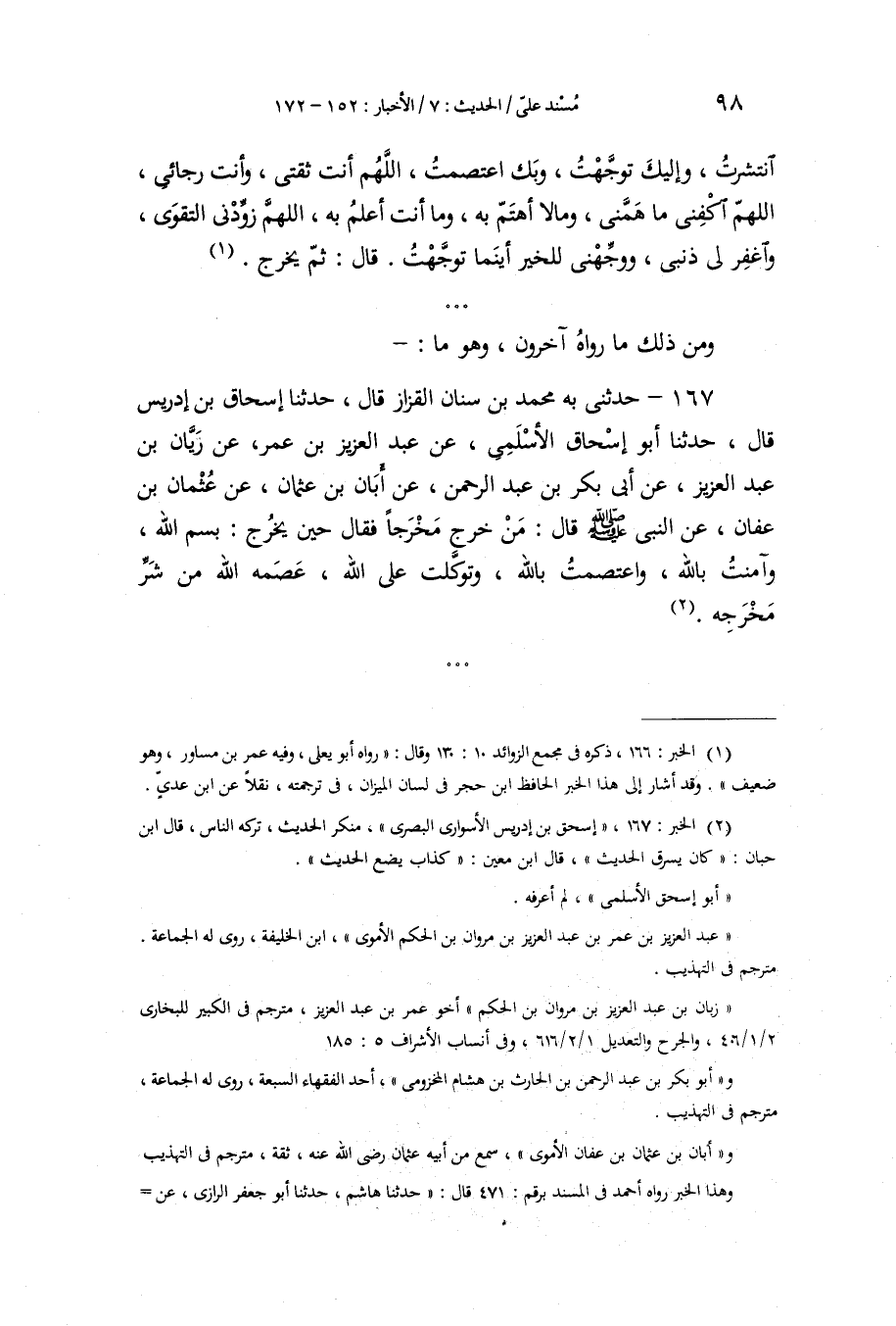 167 - حَدَّثَنِي بِهِ مُحَمَّدُ بْنُ سِنَانٍ الْقَزَّازُ قَالَ: حَدَّثَنَا إِسْحَاقُ بْنُ إِدْرِيسَ، قَالَ: حَدَّثَنَا أَبُو إِسْحَاقَ الْأَسْلَمِيُّ، عَنْ عَبْدِ الْعَزِيزِ بْنِ عُمَرَ، عَنْ رَيَّانَ بْنِ عَبْدِ الْعَزِيزِ، عَنْ أَبِي بَكْرِ بْنِ عَبْدِ الرَّحْمَنِ، عَنْ أَبَانَ بْنِ عُثْمَانَ، عَنْ عُثْمَانَ بْنِ عَفَّانَ، عَنِ النَّبِيِّ صَلَّى اللهُ عَلَيْهِ وَسَلَّمَ قَالَ: " §مَنْ خَرَجَ مَخْرَجًا فَقَالَ حِينَ يَخْرُجُ: بِسْمِ اللَّهِ، وَآمَنْتُ بِاللَّهِ، وَاعْتَصَمْتُ بِاللَّهِ، وَتَوَكَّلْتُ عَلَى اللَّهِ، عَصَمَهُ اللَّهُ مِنْ شَرِّ مَخْرَجِهِ " -[99]- وَاخْتُلِفَ فِيمَا كَانَ السَّلَفُ يَقُولُونَ فِي ذَلِكَ: نَحْوَ اخْتِلَافِ الرُّوَاةِ عَنْ رَسُولِ اللَّهِ صَلَّى اللهُ عَلَيْهِ وَسَلَّمَ فِيهِ. نَذْكُرُ مَا حَضَرَنَا مِنْ ذَلِكَ ذِكْرُهُ