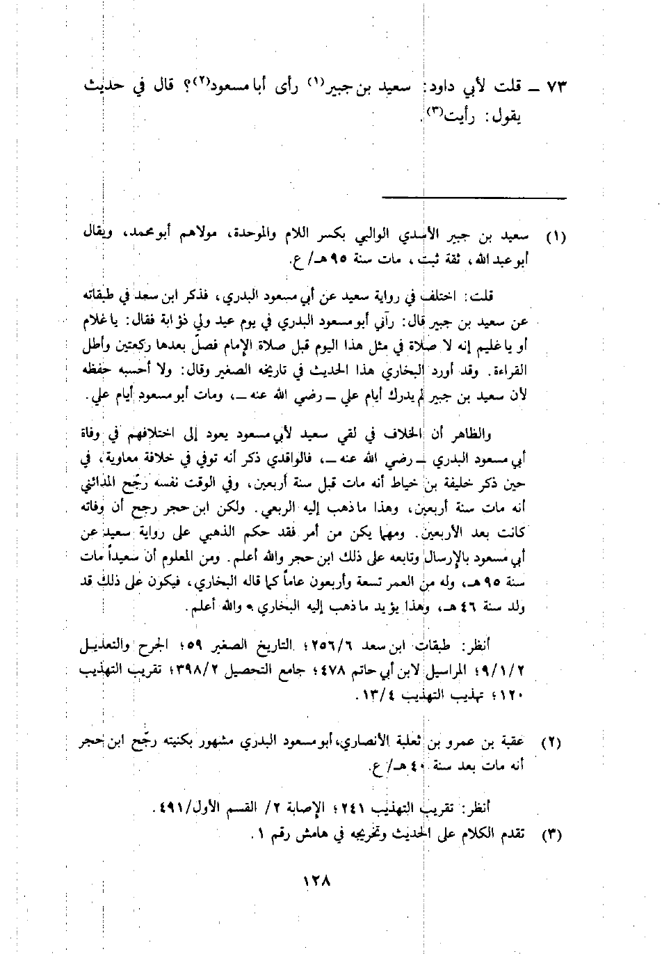 73- قُلْت لأبي دَاوُد: "سَعِيد بْن جُبير1 رأى أبا مَسْعُود2؟ قَالَ: في حديث يقول: رأيت"3.