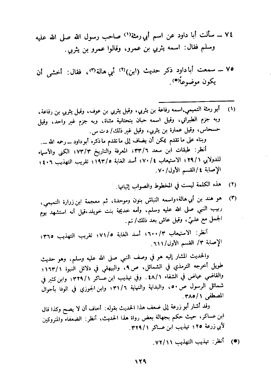 74- سَأَلْتُ أَبَا دَاوُدَ عَنْ اسم أَبِي رِمْثَةَ1 صاحب رَسُول اللَّه صَلَّى اللَّهُ عَلَيْهِ وَسَلَّمَ فَقَالَ: "اسمه يَثْرِبي بْن عَمْرو، وَقَالُوا عَمرو بْن يَثربي".