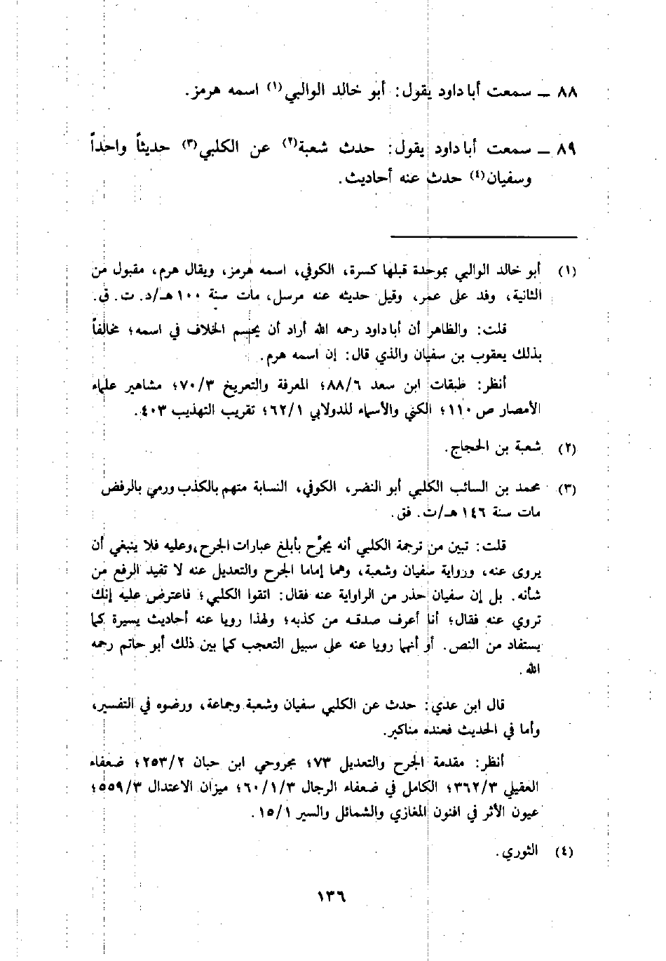 89- سمعت أبا دَاوُد يَقُول: "حدث شعبةُ2 عَن الكَلبِيِّ3 حَدِيثًا واحدًا وسفيان4 حدث عنه أحاديث".