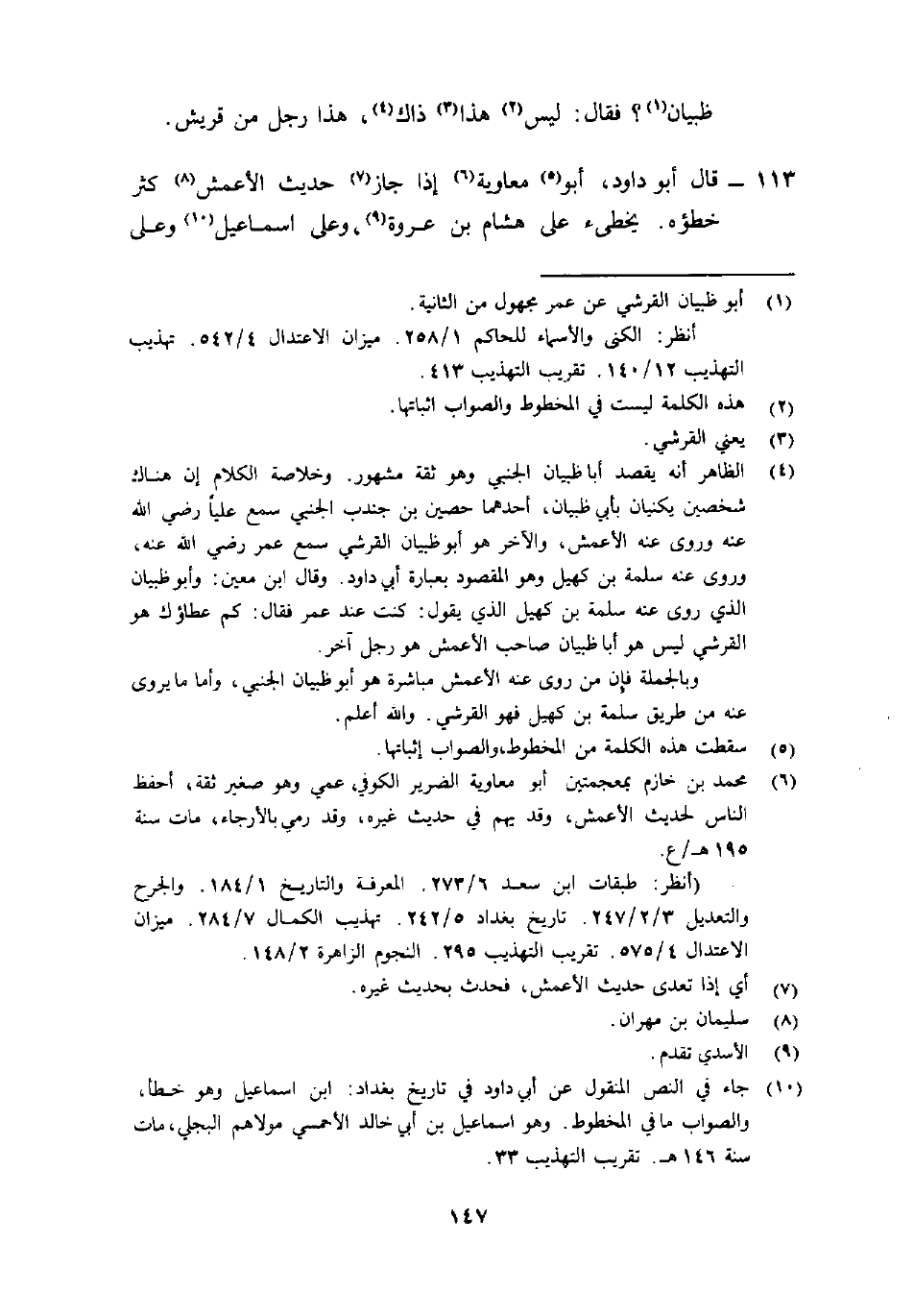 قَالَ أَبُو دَاوُدَ: " (أَبُو) 5 معاويةَ6 إِذَا جَاز7 حَدِيثَ الأَعْمَش8 كثُر خَطؤه. يخطئ عَلَى هِشَام بْن عروة9، وعلى إسماعيل10 وعلى