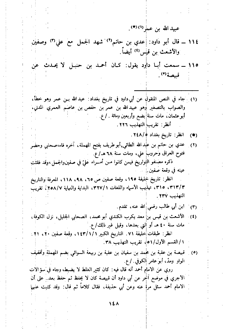 114- قَالَ أَبُو دَاوُدَ: "عَدِيُّ بْن حَاتِم2 شهد الجَمَلَ مَعَ عليٍّ3 وصِفِّينَ والأشعث بْن قَيْس4 أيضًا".