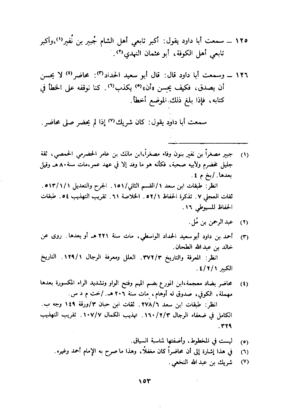 125- سمعت أبا دَاوُد يَقُول: "أكبر تابعي أَهْل الشام جُبَير بْن نُفير1، وأكبر تابعي أهل الكوفة، أَبُو عُثْمَان النَّهْدِي"2.