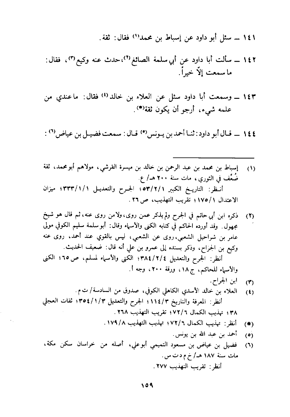143- وسمعت أبا دَاوُد سئل عَن العلاء بْن خَالِد4 فَقَالَ: "مَا عندي من علمه شَيْء، أرجو أَن يَكُون ثقة" (*) .