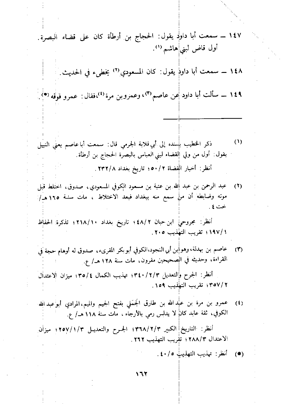 147- سمعت أبا دَاوُد يَقُول: "الْحَجَّاج بْن أَرطاة كَانَ عَلَى قضاء البصرة أول قاضِ لبني هاشم"1.
