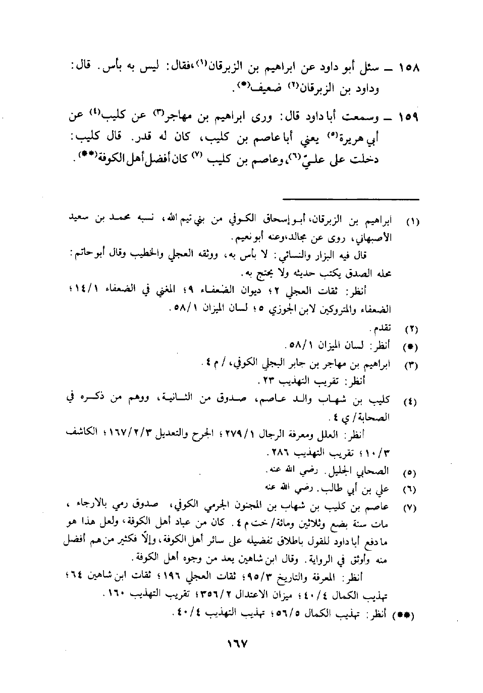 159- وسمعت أبا داود قال: "وروى إِبْرَاهِيم بْن مُهَاجر3 عَن كُلَيْبٍ4 عَن أَبِي هُرَيْرَة5 يَعْنِي أبا عَاصِم بْن كُلَيب، كَانَ لَهُ قدر. قَالَ كُلَيب: دخلتُ عَلَى عَليٍّ6، وعَاصم بْن كُلَيب7 كَانَ أفضل أهل الكوفة (() .