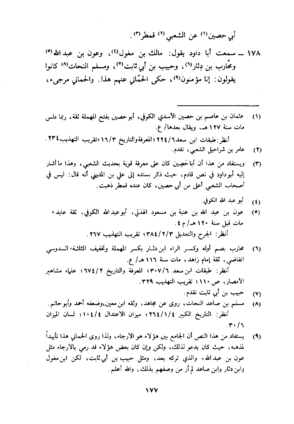 9 يستفاد من هذا النص أن الجامع بين هؤلاء هو الإرجاء، ولذا روى الحماني هذا تأييداً لمذهبه، حيث كان يدعو لذلك، ولكن وإن كان بعض هؤلاء قد رمي بالإرجاء مثل عون بن عبد الله، والذي تركه بعد، ومثل حبيب بن أبي ثابت، لكن ابن مغول وابن دثار وابن صاعد لم أر من وصفهم بذلك، والله أعلم.