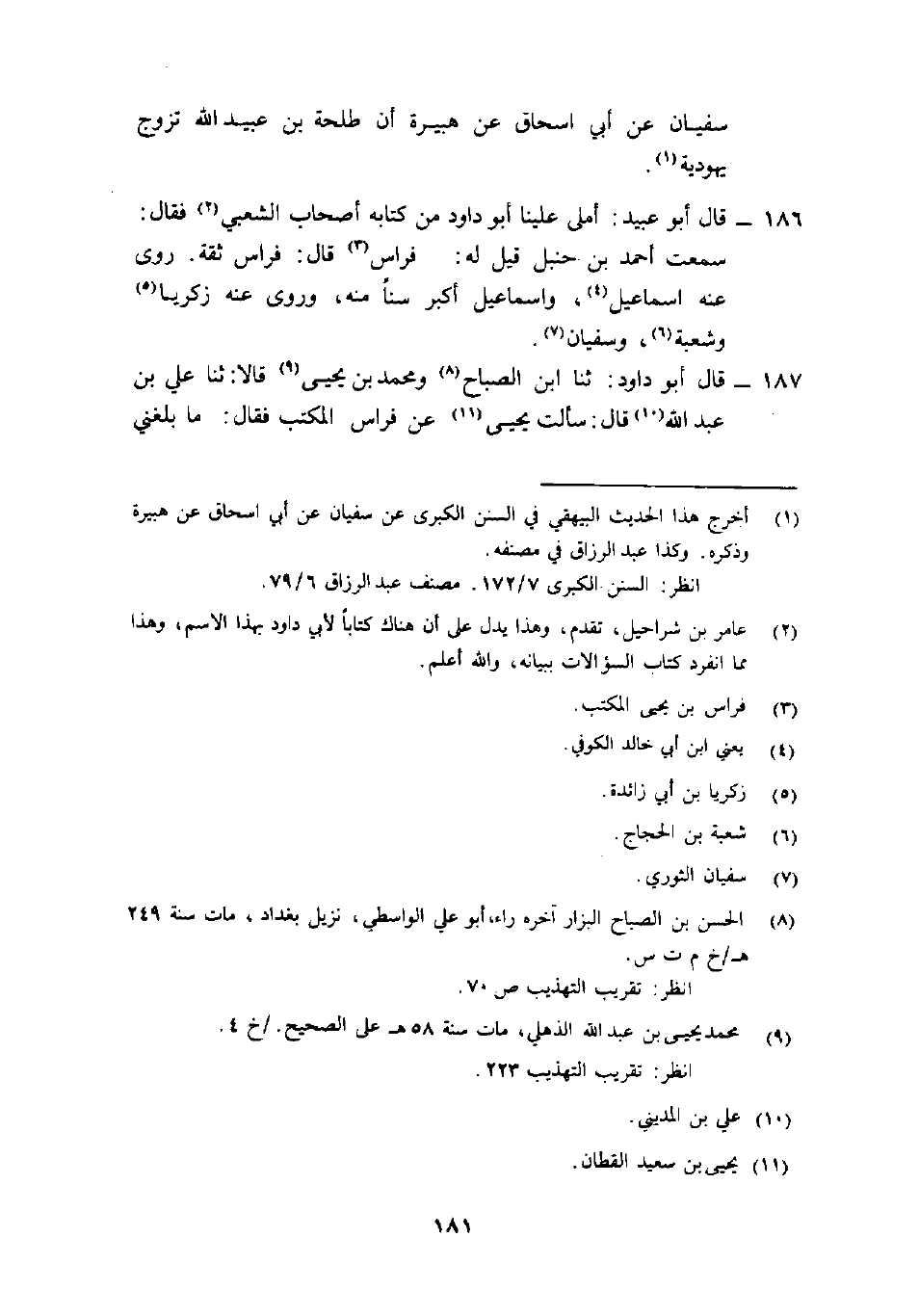قَالَ أَبُو دَاوُدَ: "ثنا ابن الصباح8 ومحمد بْن يَحْيَى9 قَالا: ثنا عَلِي بْن عَبْد اللَّهِ10 قَالَ: سألت يَحْيَى11 عَن فِراسٍ المُكْتِب فَقَالَ: ما بلغني