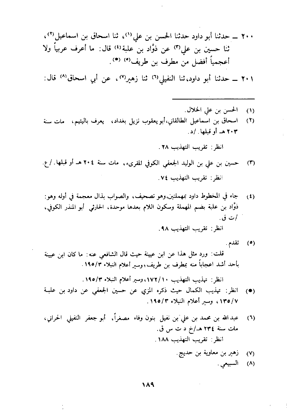 200- حدثنا أبو داود حدثنا الحَسَن بن علي1، ثنا إسحاق ابن إِسْمَاعِيل2، ثنا حُسَين بْن عَلِي3 عَن ذوَّاد بْن عُلْبَةَ4 قَالَ: "ما أعرف عربياً ولا أعجمياً أفضل من مُطَرِّف بْن طريف"5 (() .