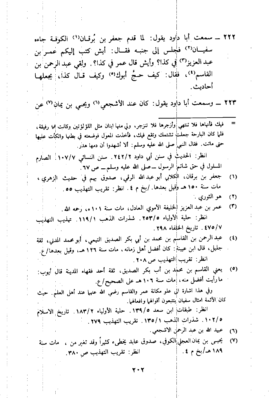 222- سمعت أبا دَاوُد يَقُول: "لما قدم جَعفَر بْن بُرقان1 الكوفة جاءه سُفْيَان2 فجلس إِلَى جنبه فَقَالَ: أيشٍ كتب إليكم عُمَر بْن عَبْد الْعَزِيز3 فِي كَذَا؟ وأيشٍ قَالَ عُمَر فِي كَذَا؟. ولقي عَبْد الرَّحْمَنِ بْن القاسم4، فَقَالَ: كَيْفَ حَجَّ أبوك5 وكيف قَالَ كَذَا، يجعلها أحاديث".