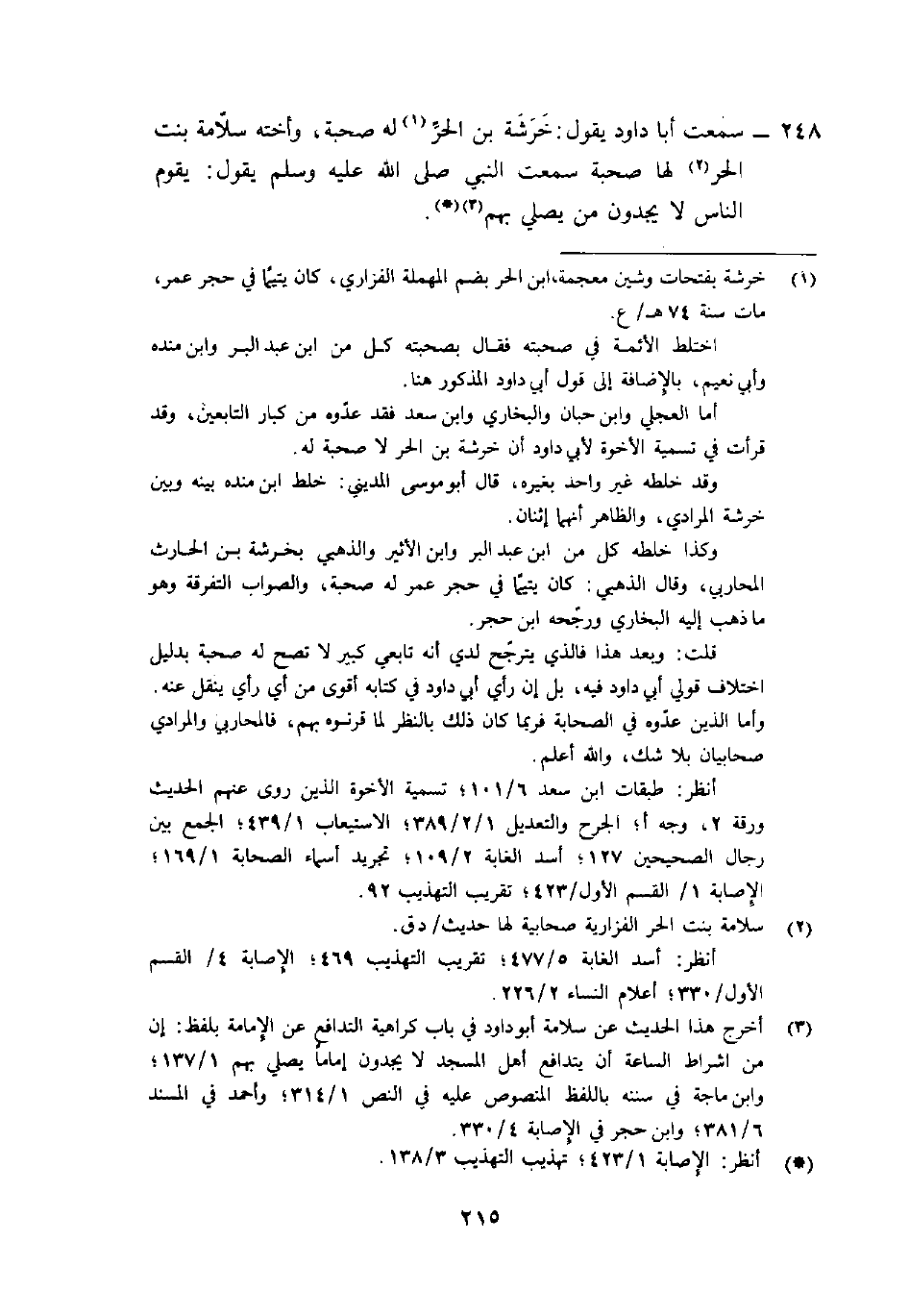 248- سمعت أبا دَاوُد يَقُول: "خَرَشَة بْن الحرِّ1 لَهُ صحبة، وأخته سَلَّامَة بنت الحُرِّ2 لَهَا صحبة سَمِعَت النَّبِي صَلَّى اللَّهُ عَلَيْهِ وسلم يقول: "يقوم الناس لا يجدُونَ من يصلى بِهِمْ" 3 (4 () .