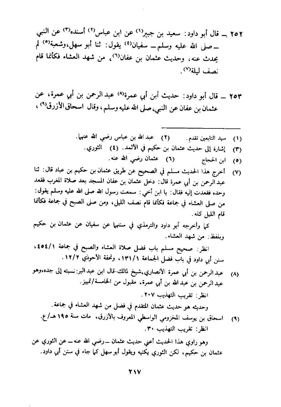 252- قَالَ أَبُو دَاوُدَ: "سَعيد بْن جُبَير1 عَن ابْن عَبَّاس2 أسنده3 عَنِ النَّبِيِّ صَلَّى اللَّهُ عَلَيْهِ وَسَلَّمَ سُفْيَان4 يَقُول: ثنا أَبُو سهل، وشعبة 5 لَمْ يحدث عَنْهُ، وحَدِيث عُثْمَان بْن عَفَّان 6، "من شهد العشاء فكأنما قام نصف ليلة" 7.