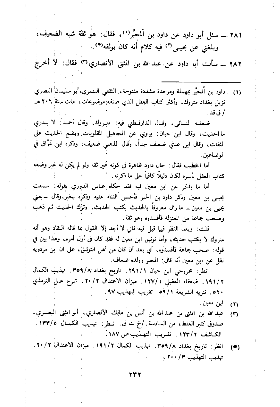 281- سئل أَبُو دَاوُدَ عَن دَاوُد بْن المحبَّر1، فَقَالَ: "هُوَ ثقة شبه الضعيف، وبلغني عَن يَحْيَى2 فِيهِ كلام أنه كان يوثقه" (() .