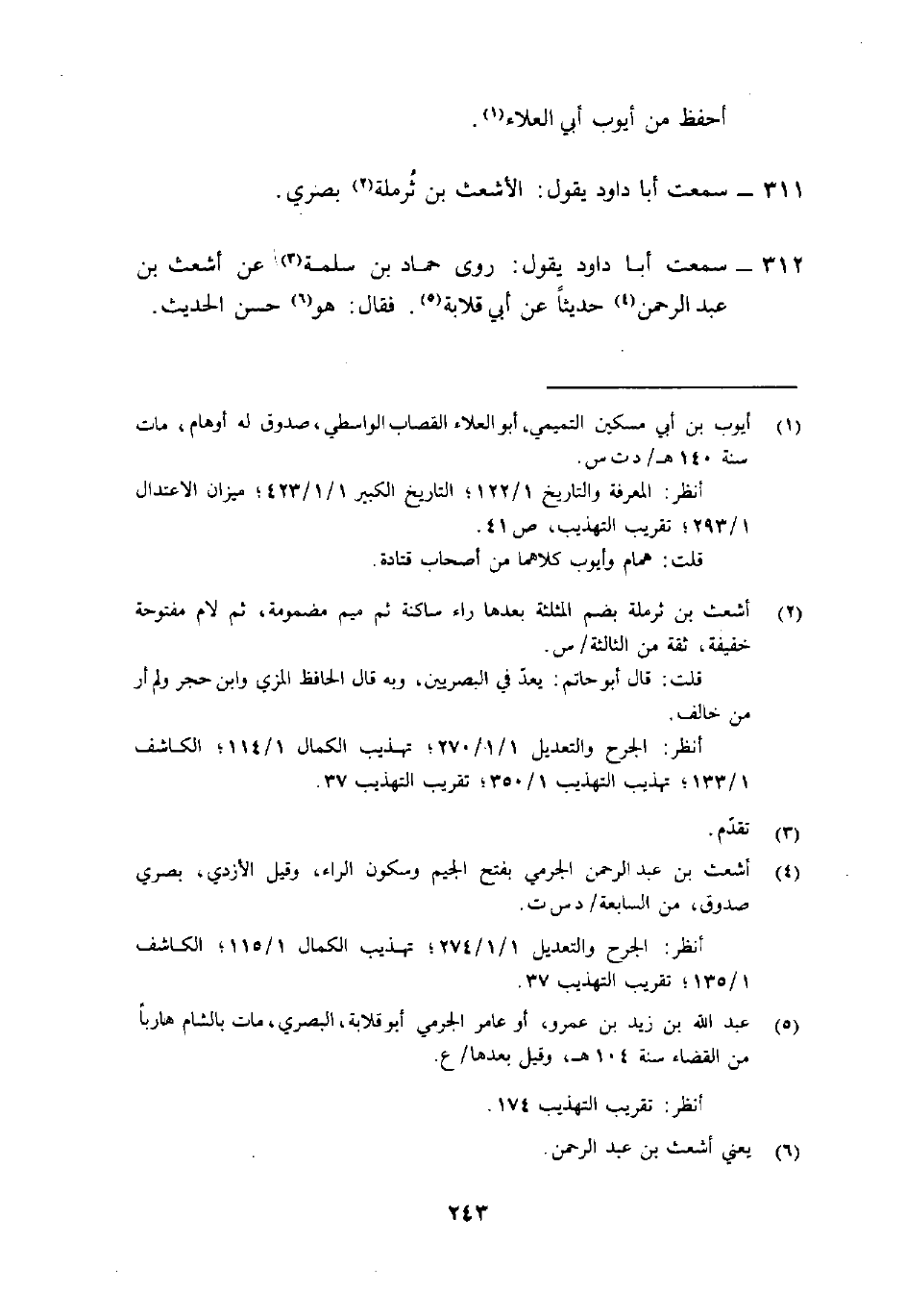 312- سمعت أبا دَاوُد يَقُول: "رَوَى حماد بْن سلمة3 عَن أشعث بْن عَبْد الرَّحْمَنِ4 حَدِيثًا عَن أَبِي قلابة5 فقال: هو6 حسن الحديث".