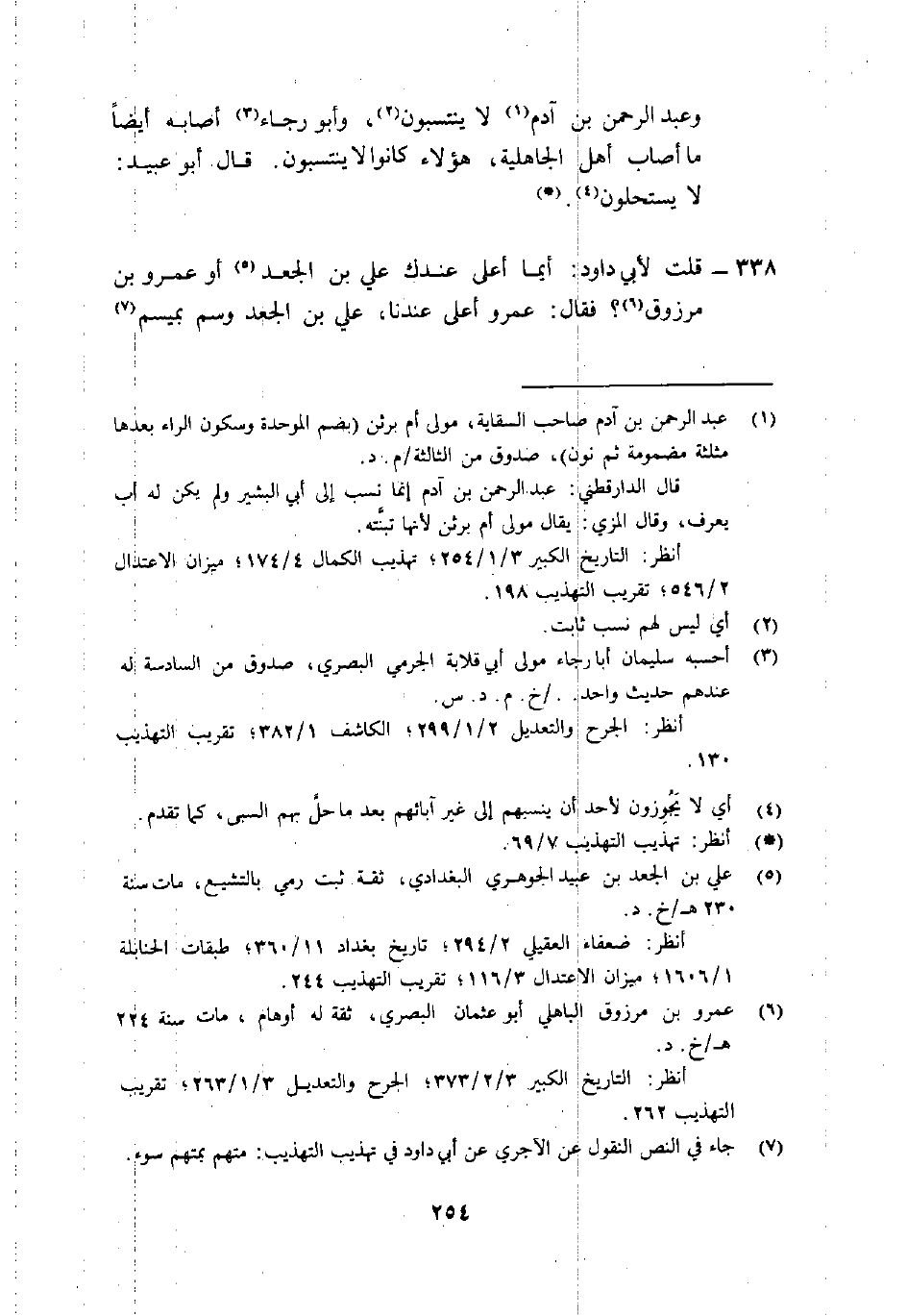 338-قُلْت لأبي دَاوُد: "أيُّما أعلى عندك عَلِي بْن الجَعْد5 أَوْ عَمْرو بْن مرزوق6؟ فَقَالَ: عَمْرو أعلى عندنا، عَلِي بْن الجَعْد وُسِم بميسَم7