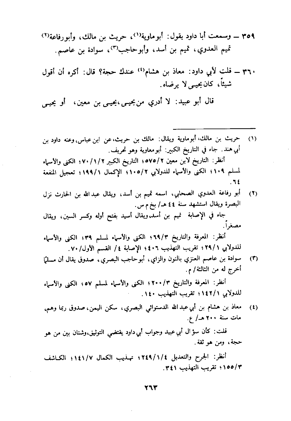 359- وسمعت أبا دَاوُد يَقُول: "أَبُو مَاوِيَّة1، حُريث بْن مَالِك، وأبو رِفَاعَة2 تميم العَدوِيُّ، تميم بْن أَسد، وأبو حاجِب3، سَوَادَة بْن عَاصِم".