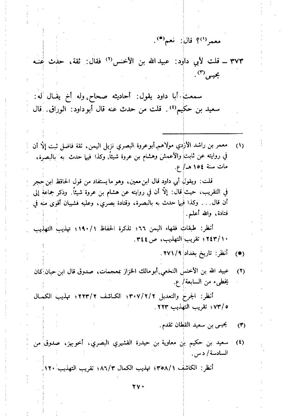 373- قُلْت لأبي دَاوُد: "عُبَيدُ اللَّه بْن الأَخْنَس2 فَقَالَ: ثقة، حدث عَنْهُ يَحْيَى"3.
