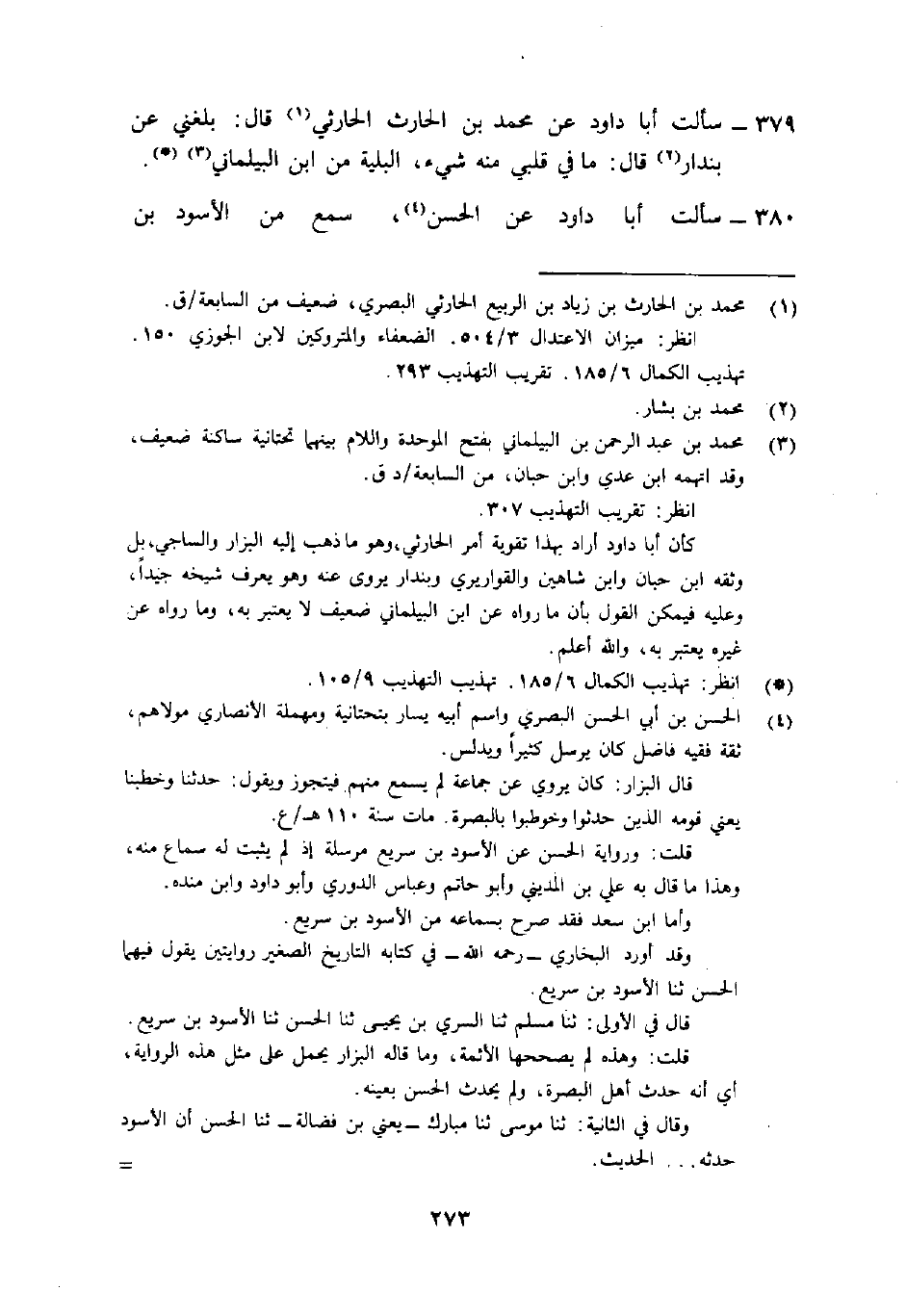 379- سألت أبا دَاوُد عَن مُحَمَّد بْن الْحَارِث الحَارثي1 قَالَ: "بلغني عَن بُنْدار2 قَالَ: مَا فِي قلبي منه شيءٌ، البَلِيَّةُ من ابْن البَيْلماني" (( (() 3.