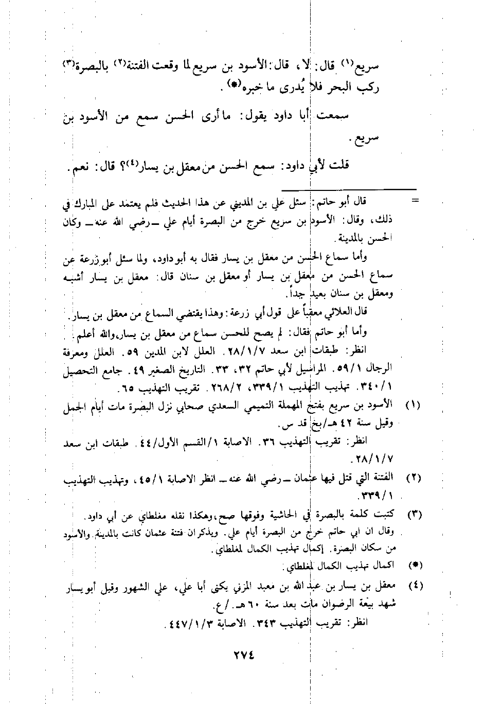 1 قال أبو حاتم: "سئل علي بن المديني عن هذا الحديث فلم يعتمد على المبارك في ذلك، وقال: الأسود بن سريع خرج من البصرة أيام علي - رضي الله عنه - وكان الحسن بالمدينة".