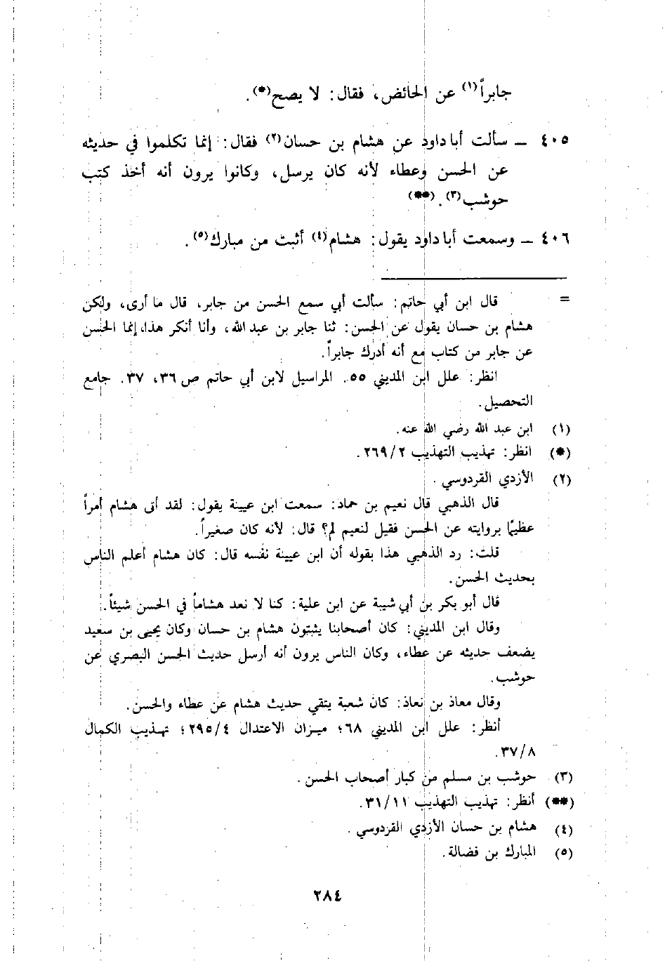 405- سألت أبا دَاوُد عَن هِشَام بْن حَسَّان2 فَقَالَ: "إِنَّمَا تكلموا فِي حَدِيثه عَن الْحَسَن وعطاء لأنه كَانَ يُرسل، وكانوا يرون أَنَّهُ أخذ كتب حَوْشَب"3 (( () .