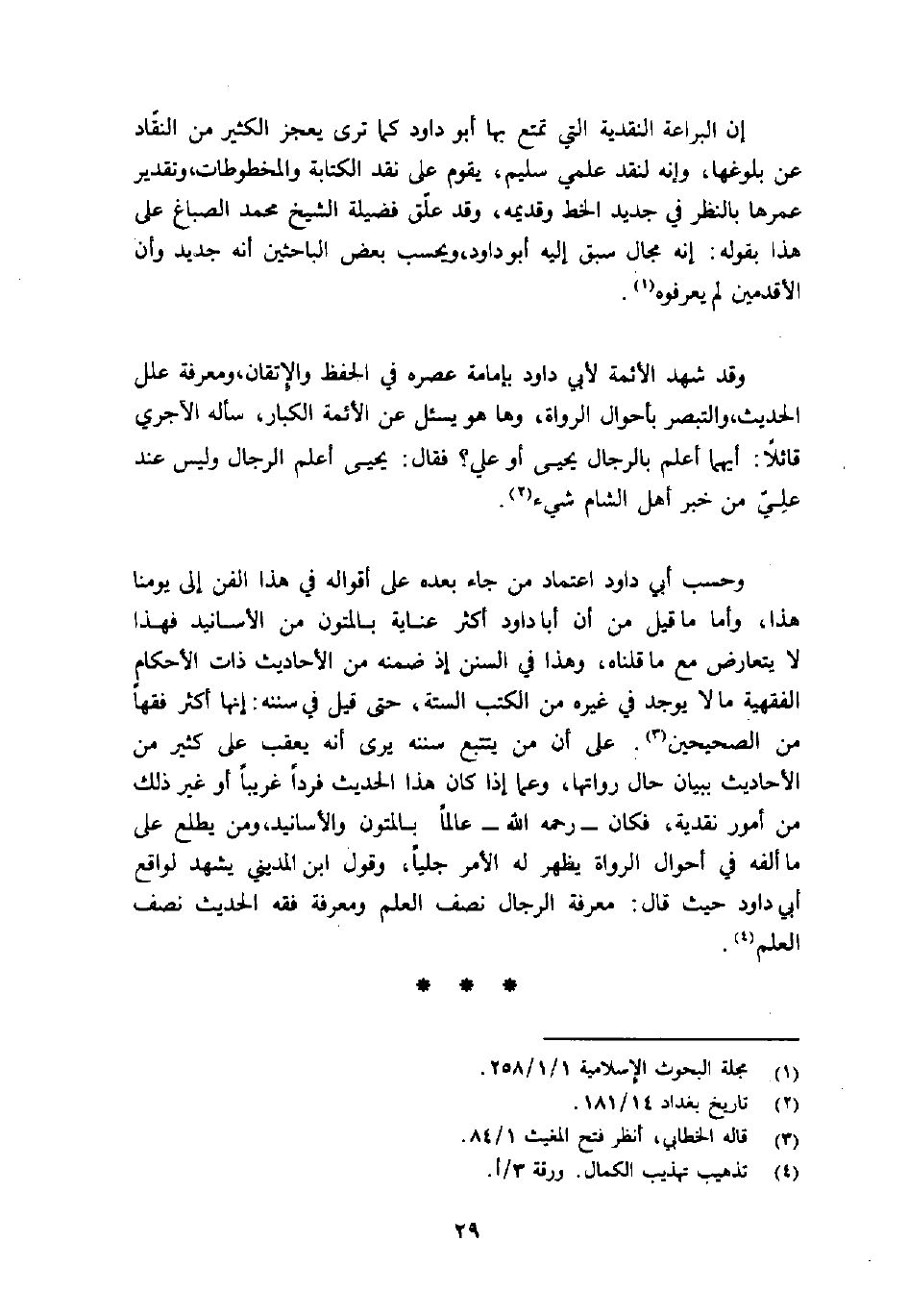 وحسب أبي داود اعتماد من جاء بعده على أقواله في هذا الفن إلى يومنا هذا، وأما ما قيل من أن أبا داود أكثر عناية بالمتون من الأسانيد فهذا لا يتعارض مع ما قلناه، وهذا في السنن إذ ضمنه من الأحاديث ذات الأحكام الفقهية ما لا يوجد في غيره من الكتب الستة، حتى قيل في سننه: "إنها أكثر فقهاً من الصحيحين"3. على أن من يتتبع سننه يرى أنه يعقب على كثير من الأحاديث ببيان حال رواتها، وعما إذا كان هذا الحديث فرداً غريباً أو غير ذلك من أمور نقدية، فكان - رحمه الله - عالماً بالمتون والأسانيد، ومن يطلع على ما ألفه في أحوال الرواة يظهر له الأمر جلياً، وقول ابن المديني يشهد لواقع أبي داود حيث قال: معرفة الرجال نصف العلم ومعرفة فقه الحديث نصف العلم4.