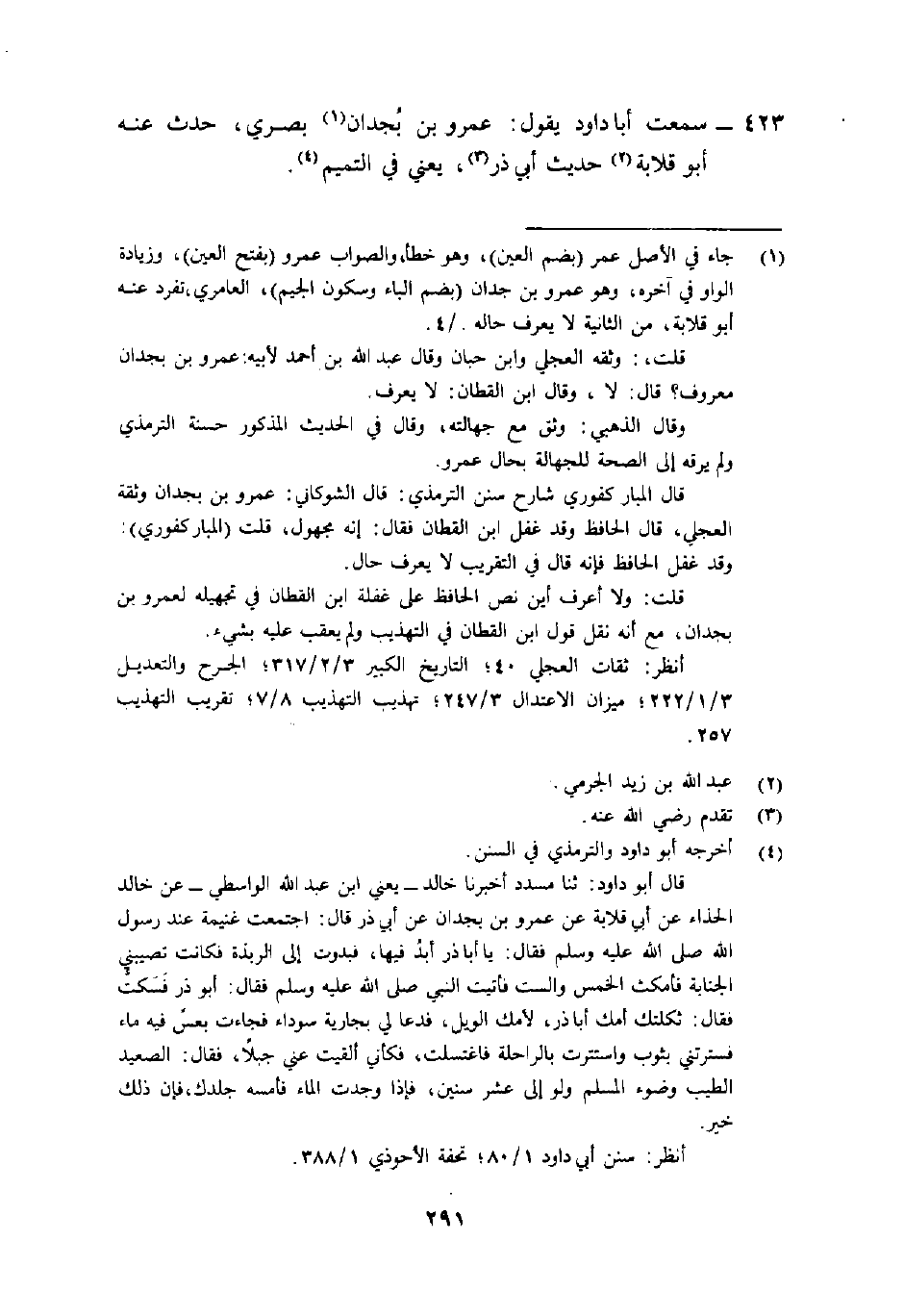 423- سمعت أبا دَاوُد يَقُول: "عَمْرو بْن بُجدان1 بصريُ، حدَّث عَنْهُ أَبُو قلابة2 حَدِيث أَبِي ذر3، يعني في التيمم"4.