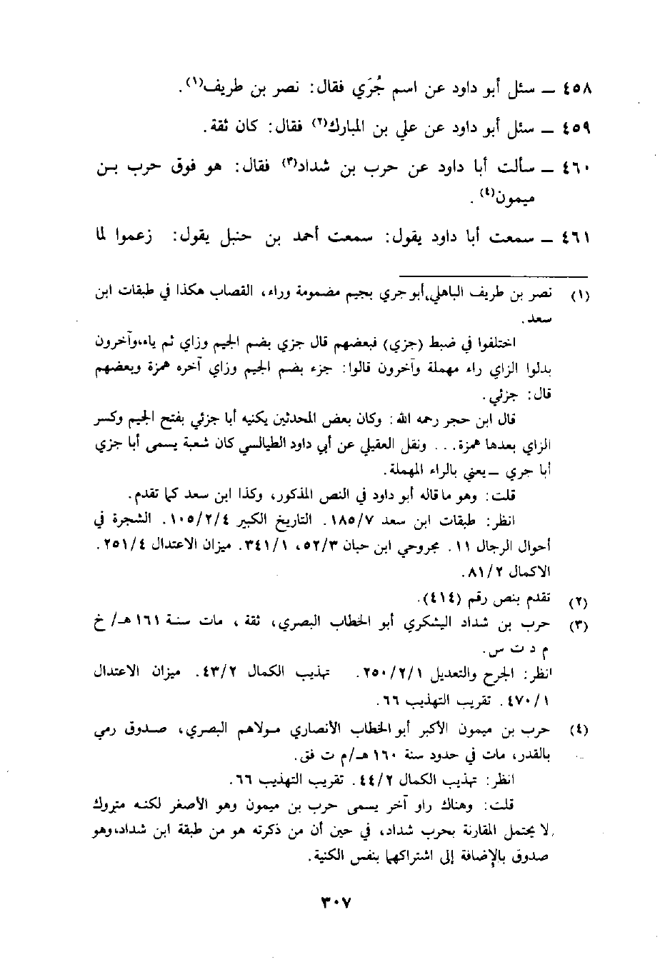 460- سألت أبا دَاوُدَ عَن حَرْبٍ بْن شَدَّادٍ3 فَقَالَ: "هُوَ فَوْقَ حَرب بْن مَيْمُون"4.
