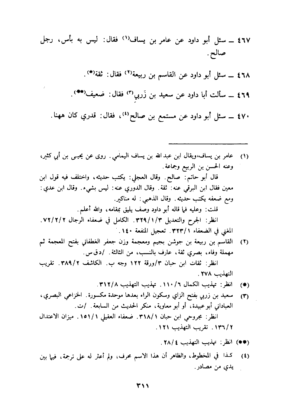 467- سئل أَبُو دَاوُدَ عَن عامر بْن يَسَاف1 فَقَالَ: "لَيْسَ بِهِ بأس، رجل صَالِح".