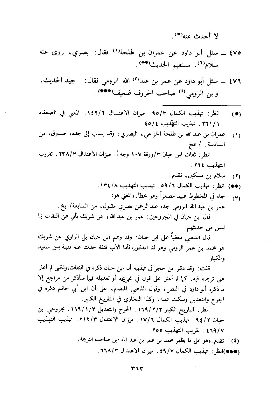 475- سئل أَبُو دَاوُدَ عَن عِمْران بْن طَلحة1 فَقَالَ: "بصري، رَوَى عَنْهُ سَلَّامٌ2، مستقيم الْحَدِيث" (() .