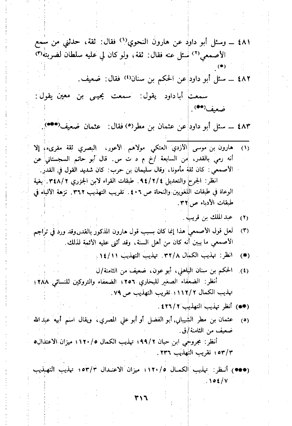 481- وسئل أَبُو دَاوُدَ عَن هَارُون النَّحوِيِّ1 فَقَالَ: "ثقة، حَدَّثَنِي من سمع الأصمعيَّ2 سئل عَنْهُ فَقَالَ: ثقة، ولو كَانَ لي عَلَيْهِ سلطان لضربته"3 (() .