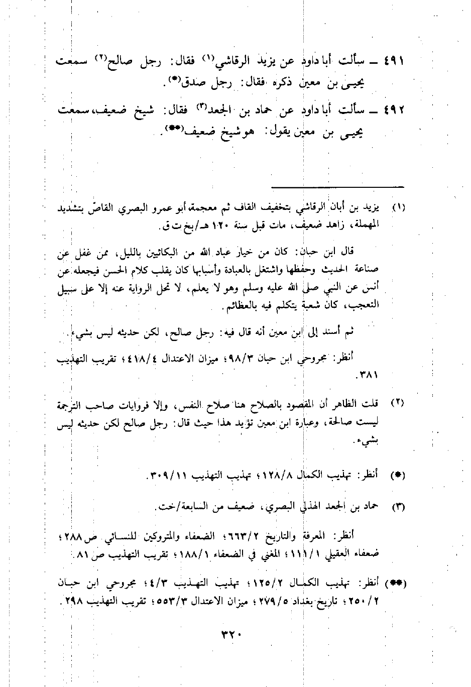 492- سألت أبا دَاوُد عَن حَمَّاد بْن الجَعْد3 فَقَالَ: "شيخ ضعيف، سمعت يَحْيَى بْن معين يقول: هو شيخ ضعيف" (( () .