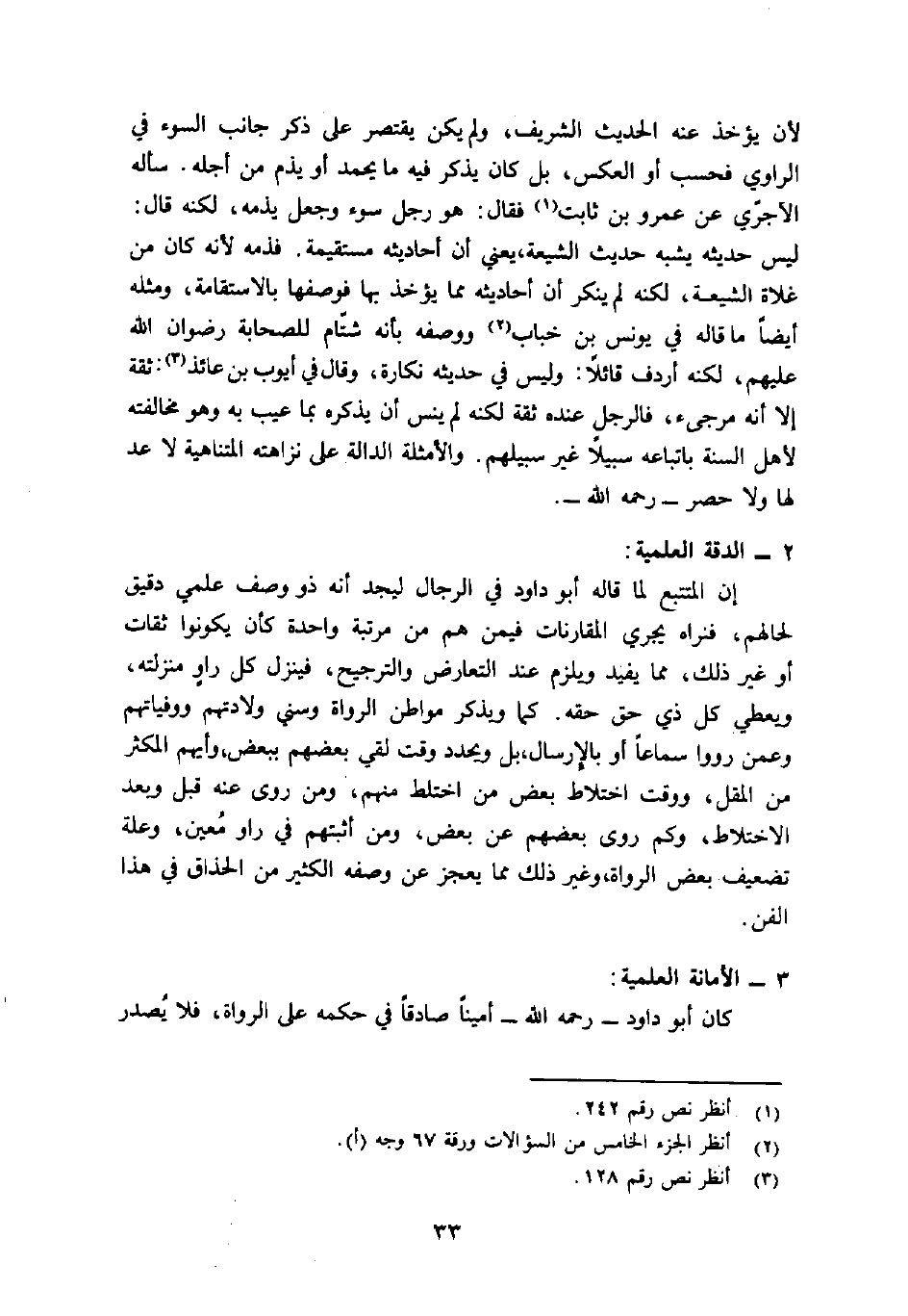 لأن يؤخذ عنه الحديث الشريف، ولم يكن يقتصر على ذكر جانب السوء في الراوي فحسب أو العكس، بل كان يذكر فيه ما يحمد أو يذم من أجله. سأله الآجري عَن عَمرو بْن ثابت1 فَقَالَ: هو رجل سوء وجعل يذمه، لكنه قال: ليس حديثه يشبه حديث الشيعة، يعني أن أحاديثه مستقيمة. فذمه لأنه كان من غلاة الشيعة، لكنه لم ينكر أن أحاديثه مما يؤخذ بها فوصفها بالاستقامة، ومثله أيضاً ما قاله في يونس بن خباب2 ووصفه بأنه شتّام للصحابة - رضوان الله عليهم -، لكنه أردف قائلاً: وليس في حديثه نكارة، وقال في أيوب بن عائذ3: "ثقة إلا أنه مرجئ"، فالرجل عنده ثقة لكنه لم ينس أن يذكره بما عيب به وهو مخالفته لأهل السنة باتباعه سبيلاً غير سبيلهم. والأمثلة الدالة على نزاهته المتناهية لا عد لها ولا حصر رحمه الله.