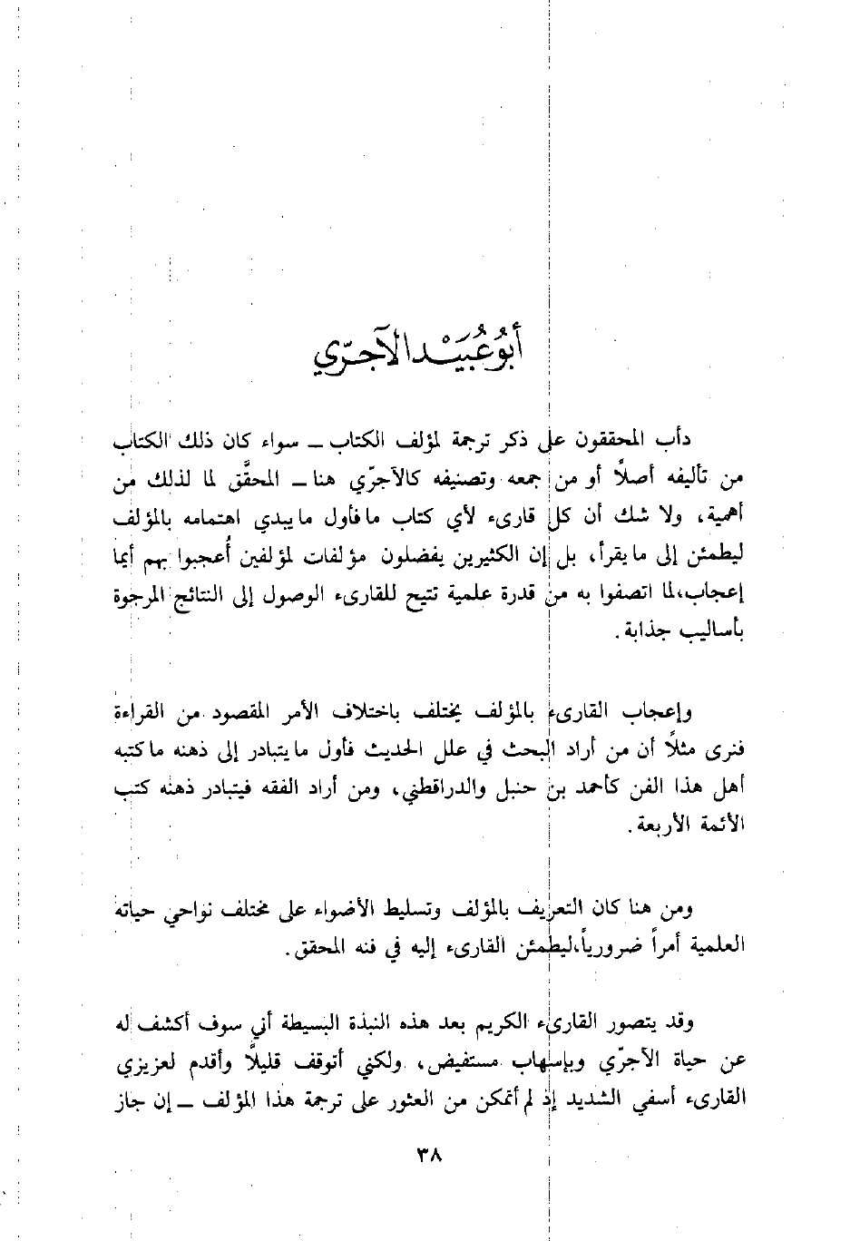 دأب المحققون على ذكر ترجمة لمؤلف الكتاب - سواء كان ذلك الكتاب من تأليفه أصلاً أو من جمعه وتصنيفه كالآجرّي هنا - المحقَّق لما لذلك من أهمية، ولا شك أن كل قارئ لأي كتاب ما فأول ما يبدي اهتمامه بالمؤلف ليطمئن إلى ما يقرأ، بل إن الكثيرين يفضلون مؤلفات لمؤلفين أُعجبوا بهم أيما إعجاب، لما اتصفوا به من قدرة علمية تتيح للقارئ الوصول إلى النتائج المرجوة بأساليب جذابة.