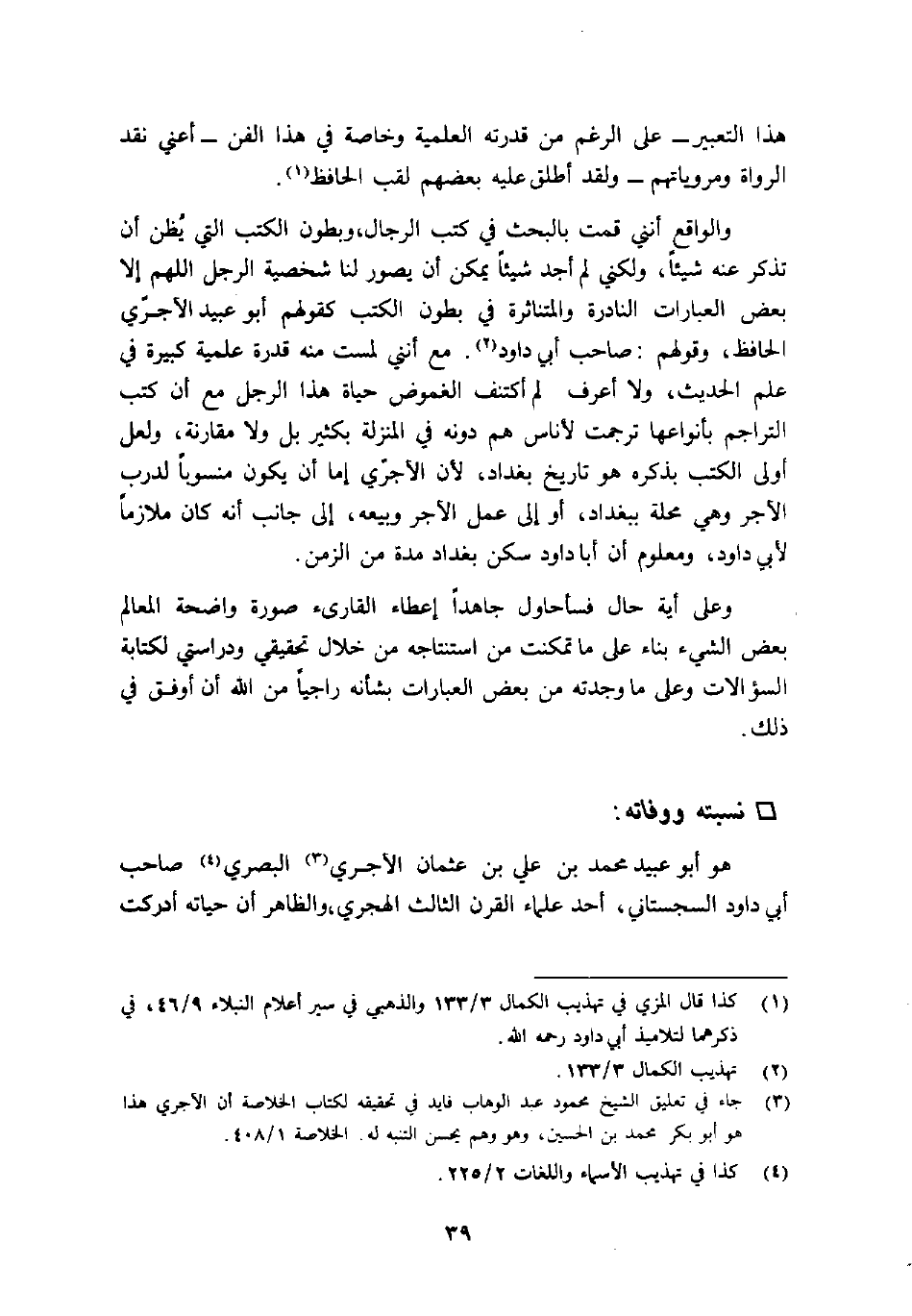 والواقع أنني قمت بالبحث في كتب الرجال، وبطون الكتب التي يُظن أن تذكر عنه شيئاً، ولكني لم أجد شيئاً يمكن أن يصور لنا شخصية الرجل اللهم إلا بعض العبارات النادرة والمتناثرة في بطون الكتب كقولهم أبو عبيد الآجرّي الحافظ، وقولهم: صاحب أبي داود2. مع أنني لمست منه قدرة علمية كبيرة في علم الحديث، ولا أعرف لم أكتنف الغموض حياة هذا الرجل مع أن كتب التراجم بأنواعها ترجمت لأناس هم دونه في المنزل بكثير بل ولا مقارنة ولعل أولى الكتب بذكره هو تاريخ بغداد، لأن الآجرّي إما أن يكون منسوباً لدرب الآجر وهي محلة ببغداد، أو إلى عمل الآجر وبيعه، إلى جانب أنه كان ملازماً لأبي داود، ومعلوم أن أبا داود سكن بغداد مدة من الزمن.