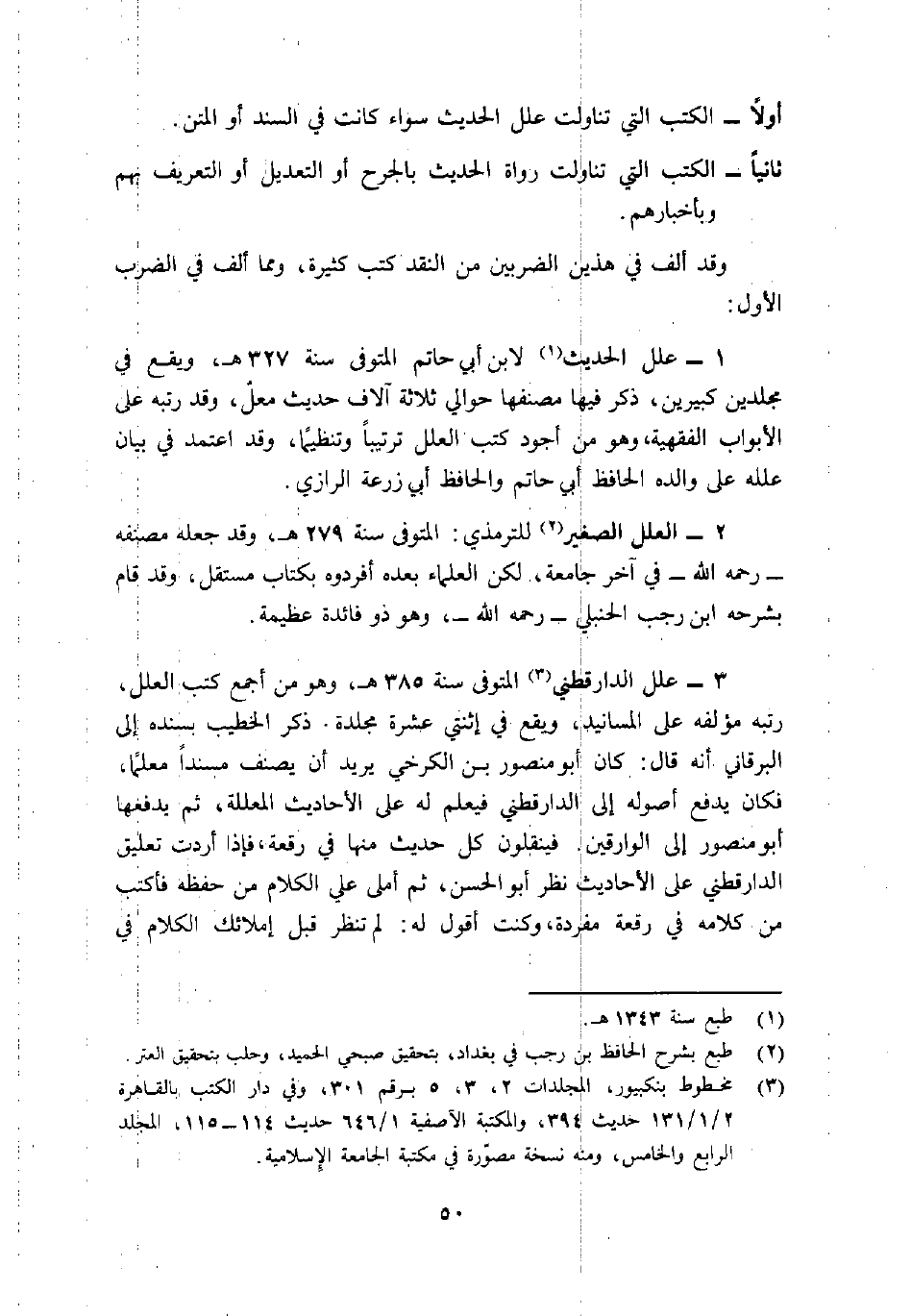1- علل الحديث 1 لابن أبي حاتم المتوفى سنة 327هـ، ويقع في مجلدين كبيرين، ذكر فيها مصنفها حوالي ثلاثة آلاف حديث معلّ، وقد رتبه على الأبواب الفقهية، وهو من أجود كتب العلل ترتيباً وتنظيماً، وقد اعتمد في بيان علله على والده الحافظ أبي حاتم والحافظ أبي زرعة الرازي.